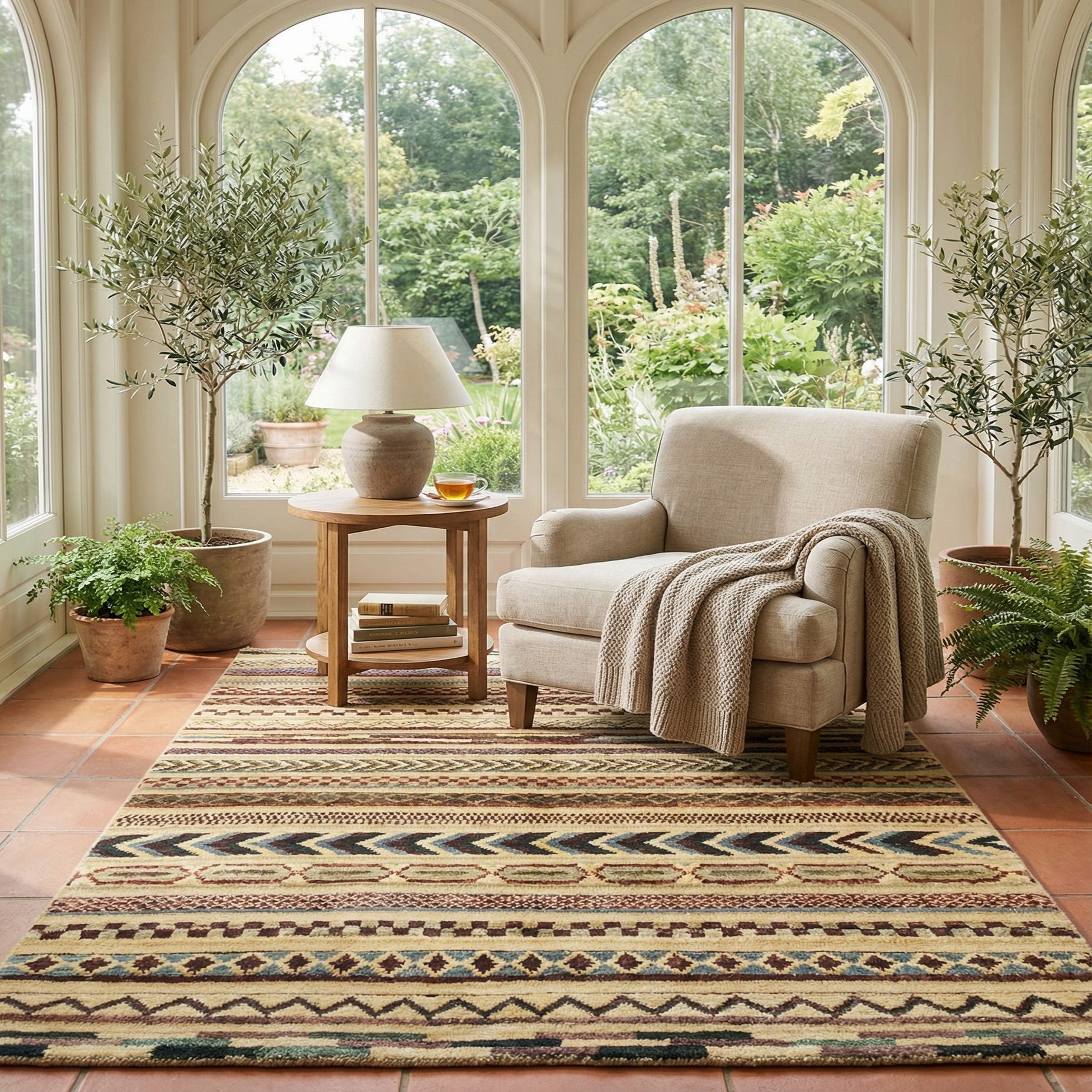 Primary color is Multi. Colors in this rug include: Multi, Beige, Black, Brown, Cream, Green, Light Blue, Light Green, Maroon, Plum Red.