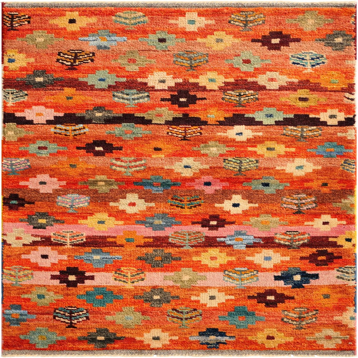 Primary color is Multi. Colors in this rug include: Multi, Beige, Blue, Brown, Red, Orange, Ivory, Navy Blue, Yellow, Pink.