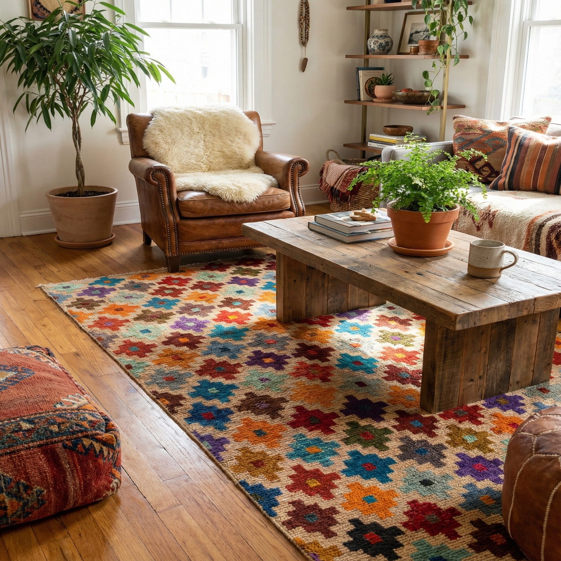Primary color is Multi. Colors in this rug include: Multi, Blue, Cream, Teal, Terracotta, Turquoise, Yellow, Purple.