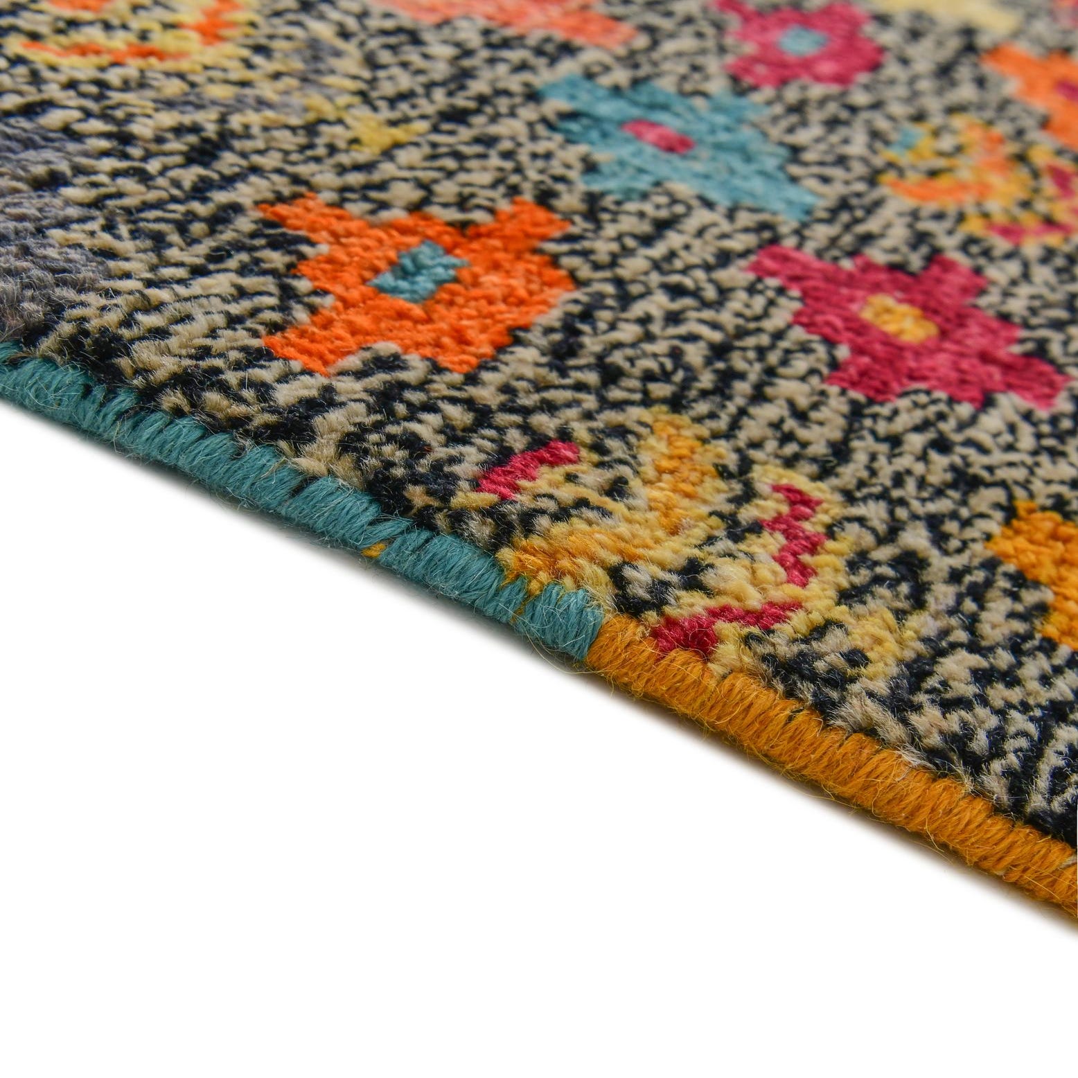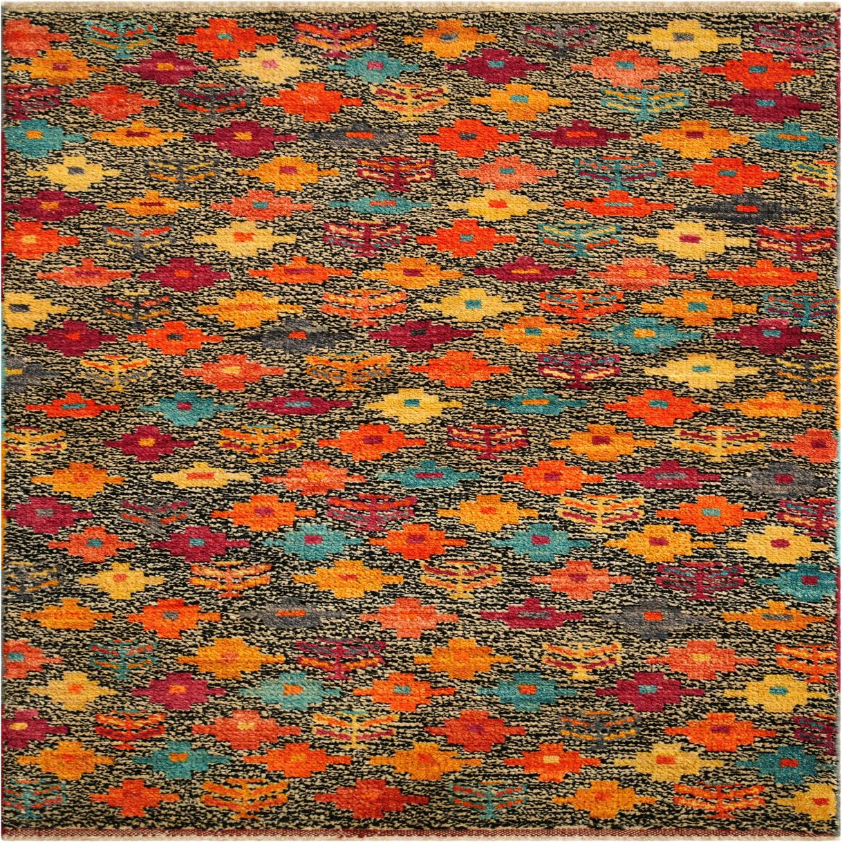 Primary color is Multi. Colors in this rug include: Multi, Beige, Black, Blue, Brown, Cream, Gray, Orange, Yellow, Red.