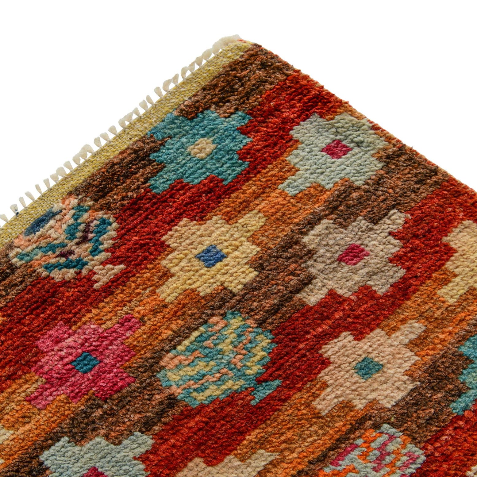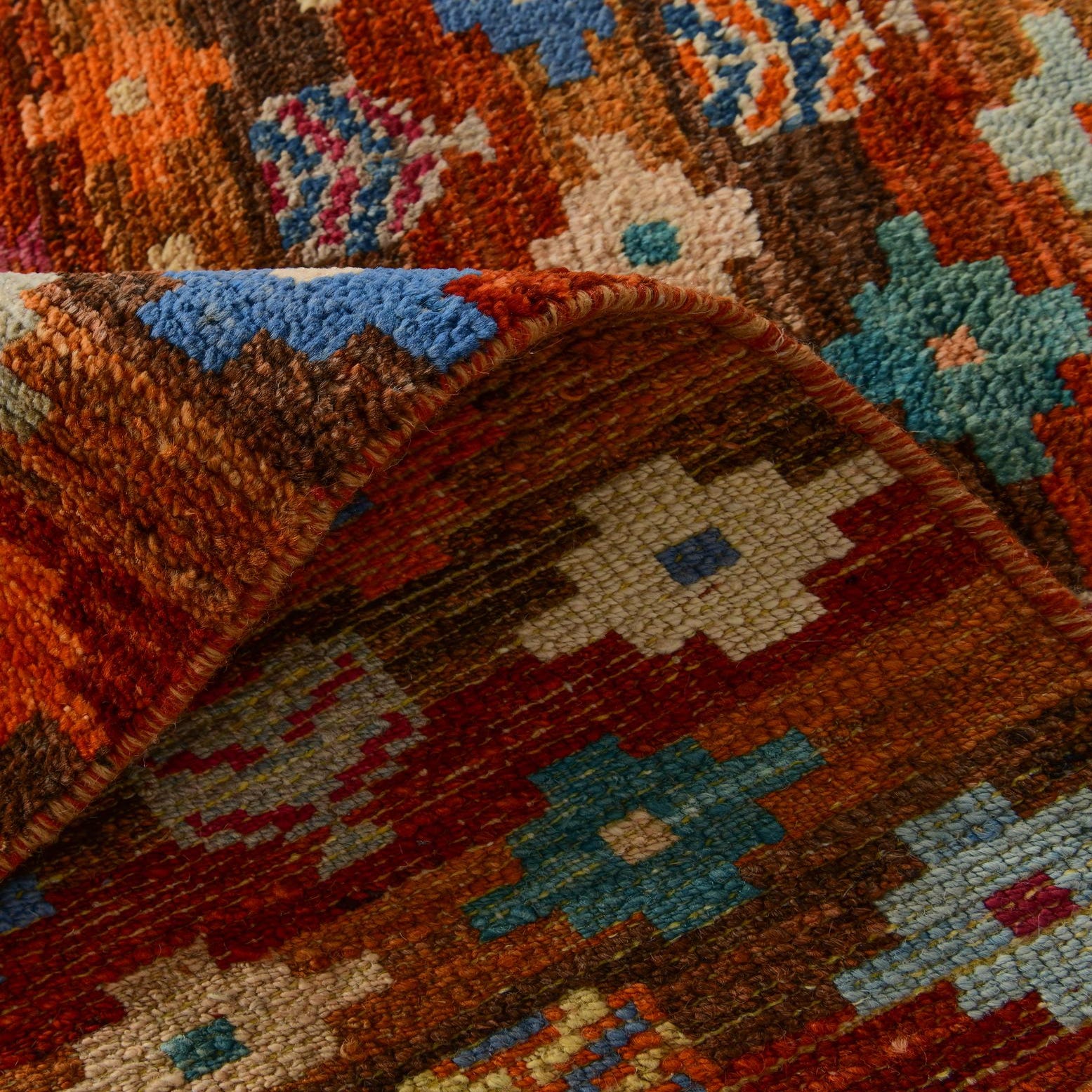 Primary color is Multi. Colors in this rug include: Multi, Beige, Blue, Brown, Green, Ivory, Orange, Red.