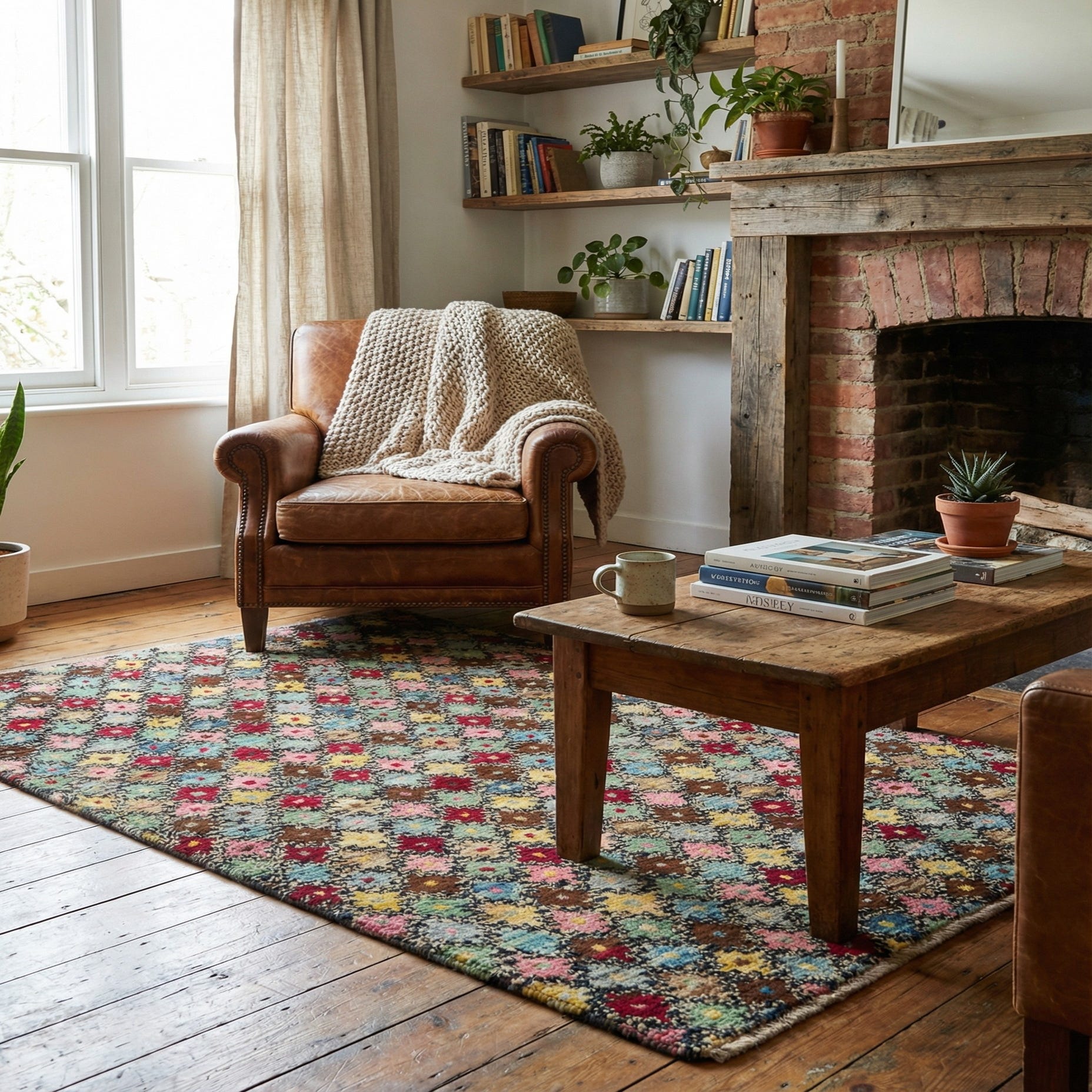 Primary color is Multi. Colors in this rug include: Multi, Black, Brown, Burgundy, Gray, Green, Tan, Teal, Yellow, Pink, Ivory, Light Blue, Light Brown, Light Green, Light Salmon.