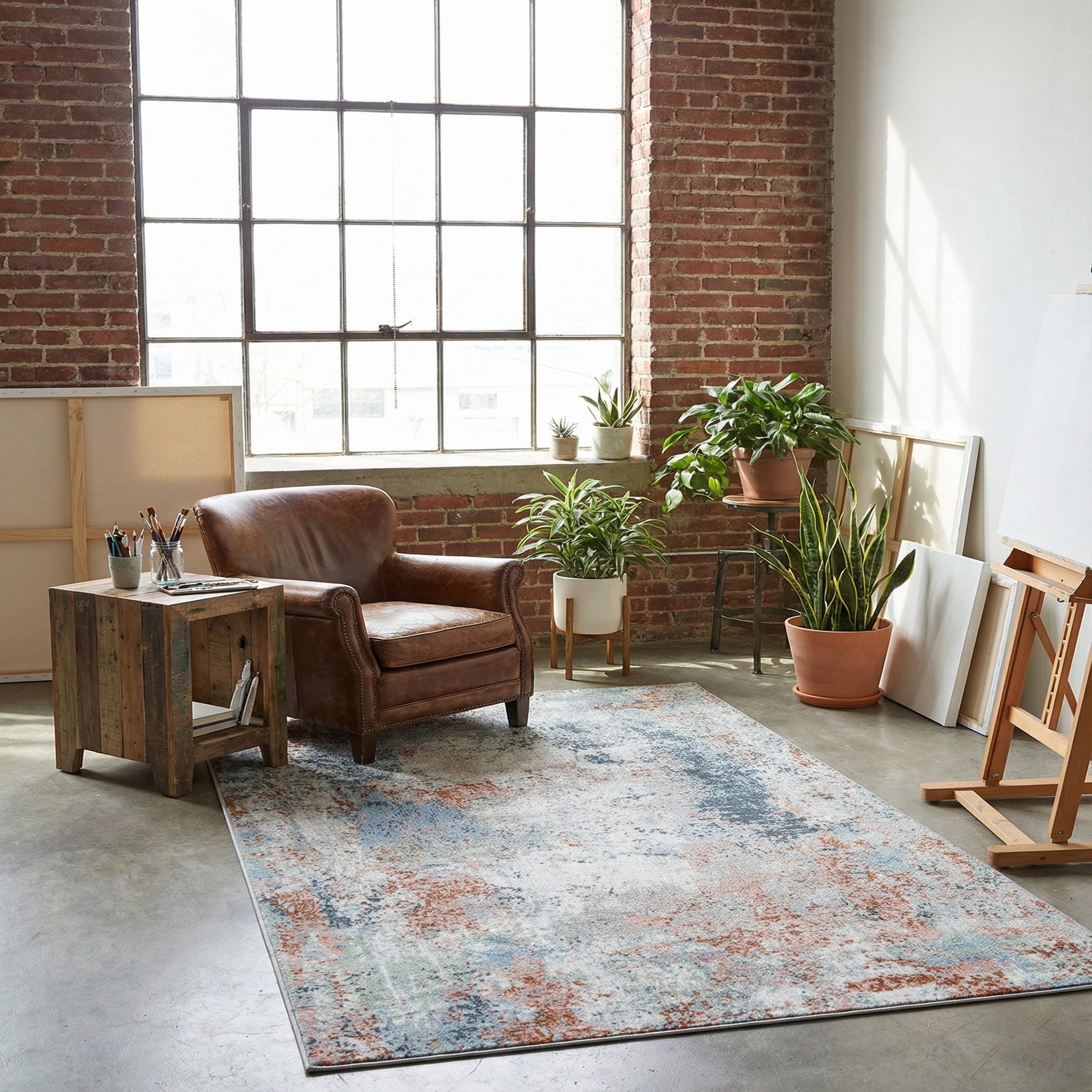 Primary color is Multi. Colors in this rug include: Multi, Blue, Gray, Light Blue, Navy Blue, Rust Red, Pink.