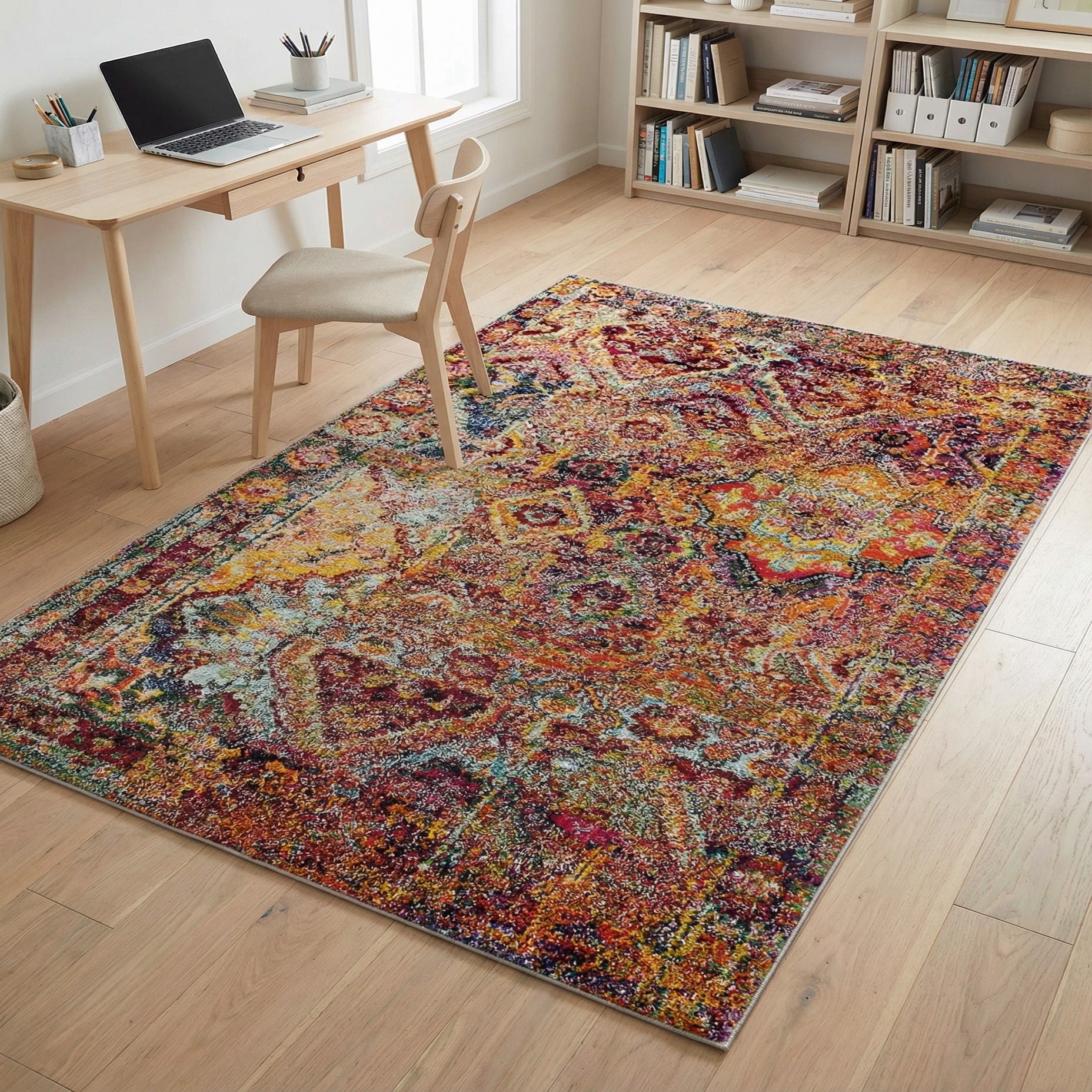 Primary color is Multi. Colors in this rug include: Multi, Blue, Gold, Navy Blue, Light Blue, Maroon, Yellow.