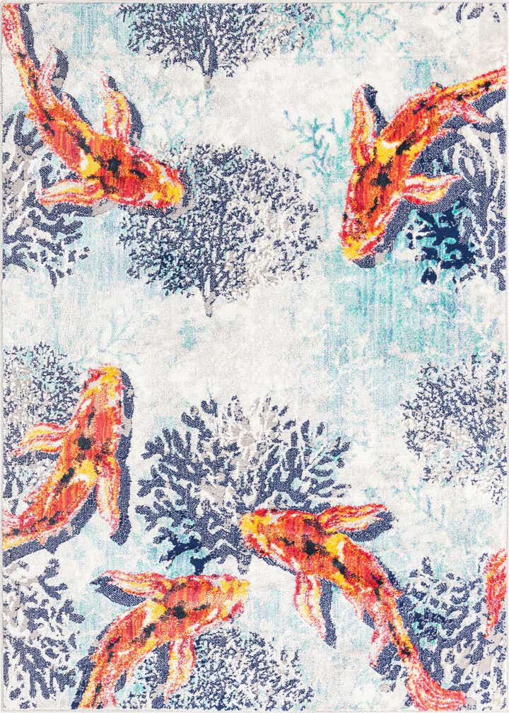 Primary color is Multi. Colors in this rug include: Multi, Ivory, Light Green, Navy Blue, Red, Orange.