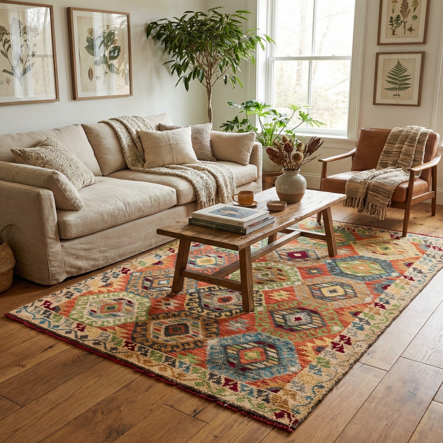 Primary color is Multi. Colors in this rug include: Multi, Beige, Blue, Brown, Gray, Green, Orange, Red, Tan, Cream.