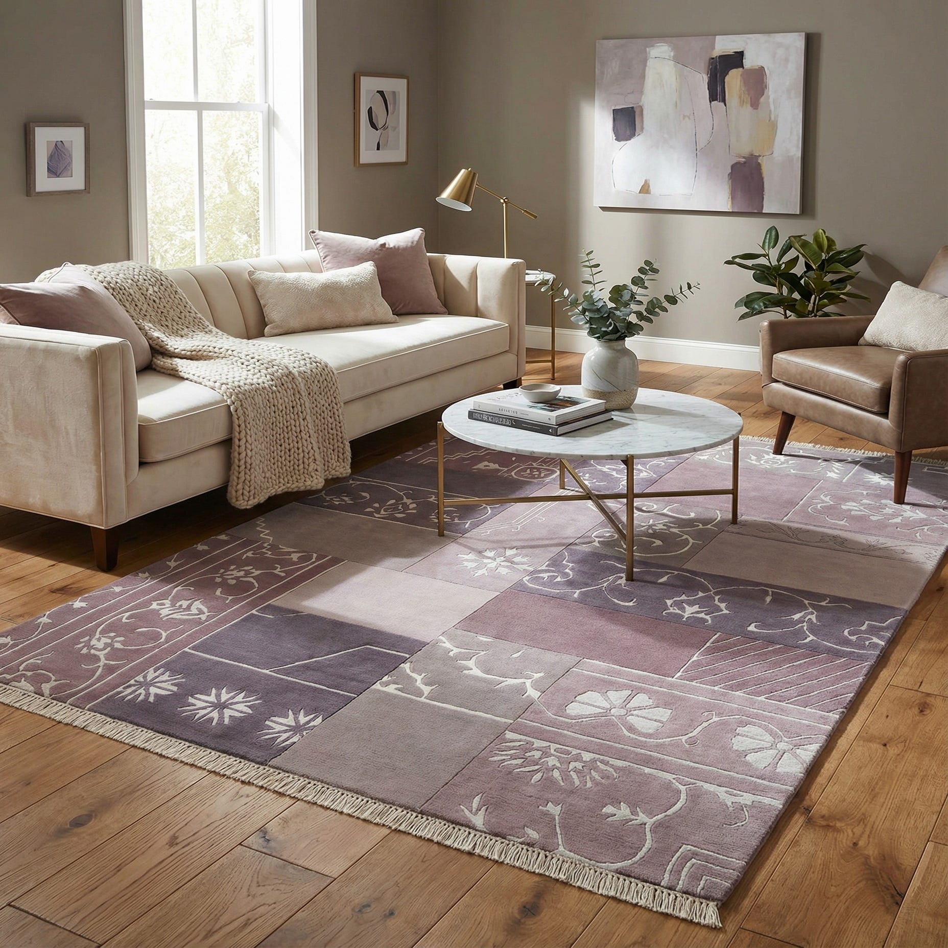 Primary color is Multi. Colors in this rug include: Multi, Beige, Gray, Puce, Tan, Purple.