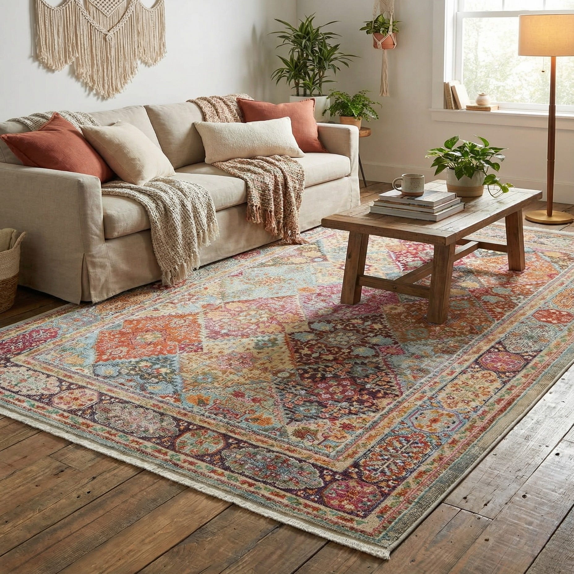Primary color is Multi. Colors in this rug include: Multi, Burgundy, Gold, Orange, Red, Pink, Blue, Light Blue.