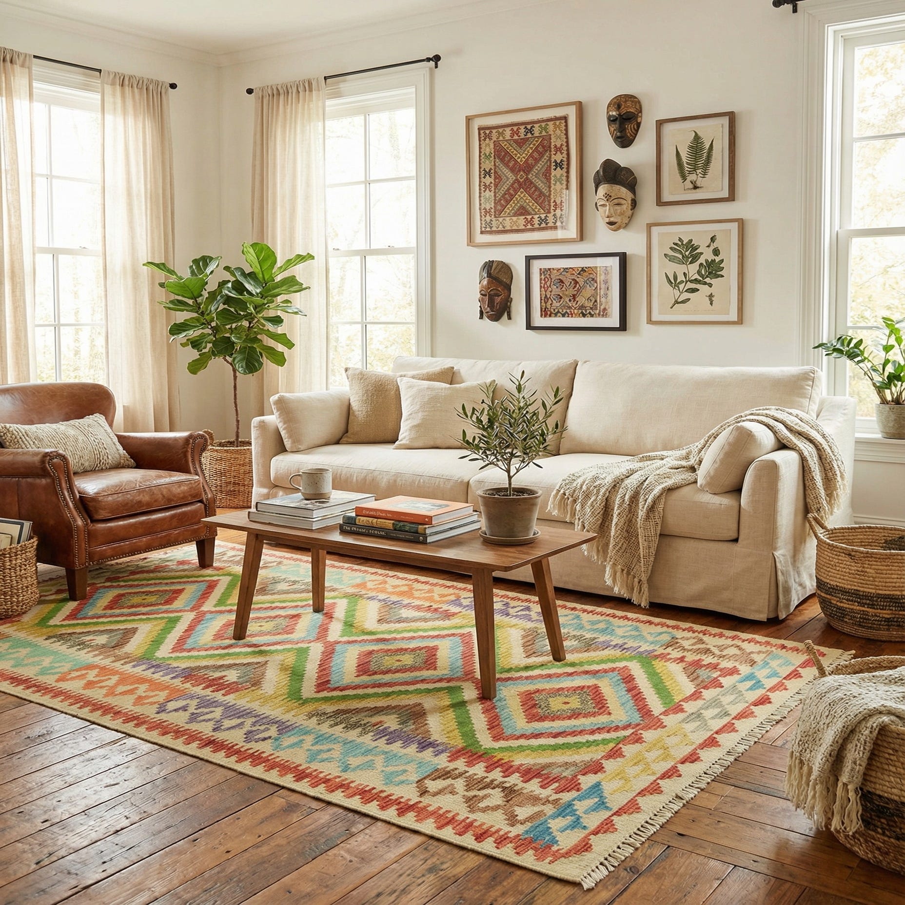 Primary color is Multi. Colors in this rug include: Multi, Beige, Blue, Gray, Green, Purple, Red, Yellow, Orange, Brown.