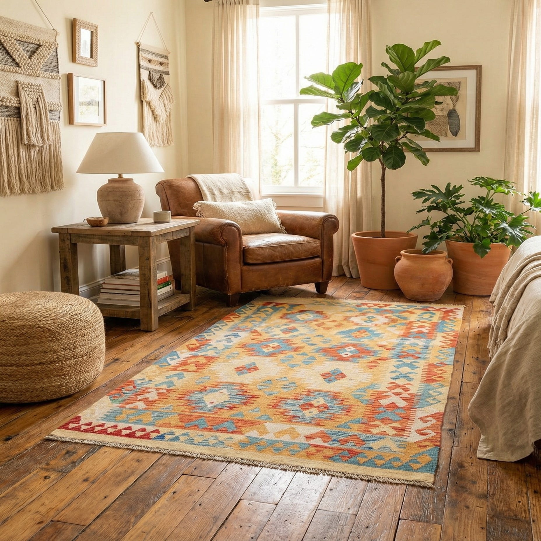 Primary image 3' 6 x 6' 5  Hand Woven Kilim Maymana Wool Rug
