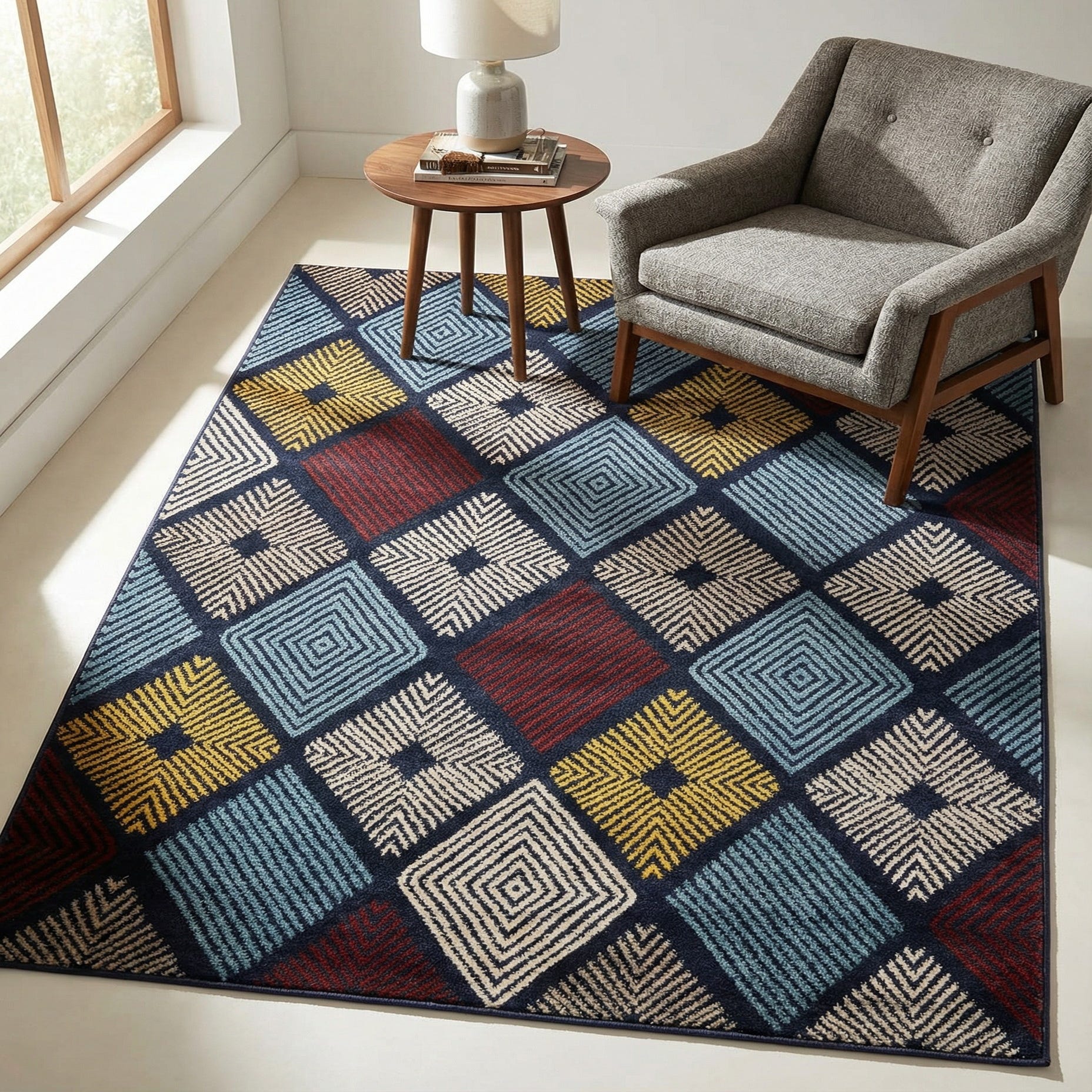 Primary color is Multi. Colors in this rug include: Multi, Blue, Ivory, Yellow, Red, Navy Blue.
