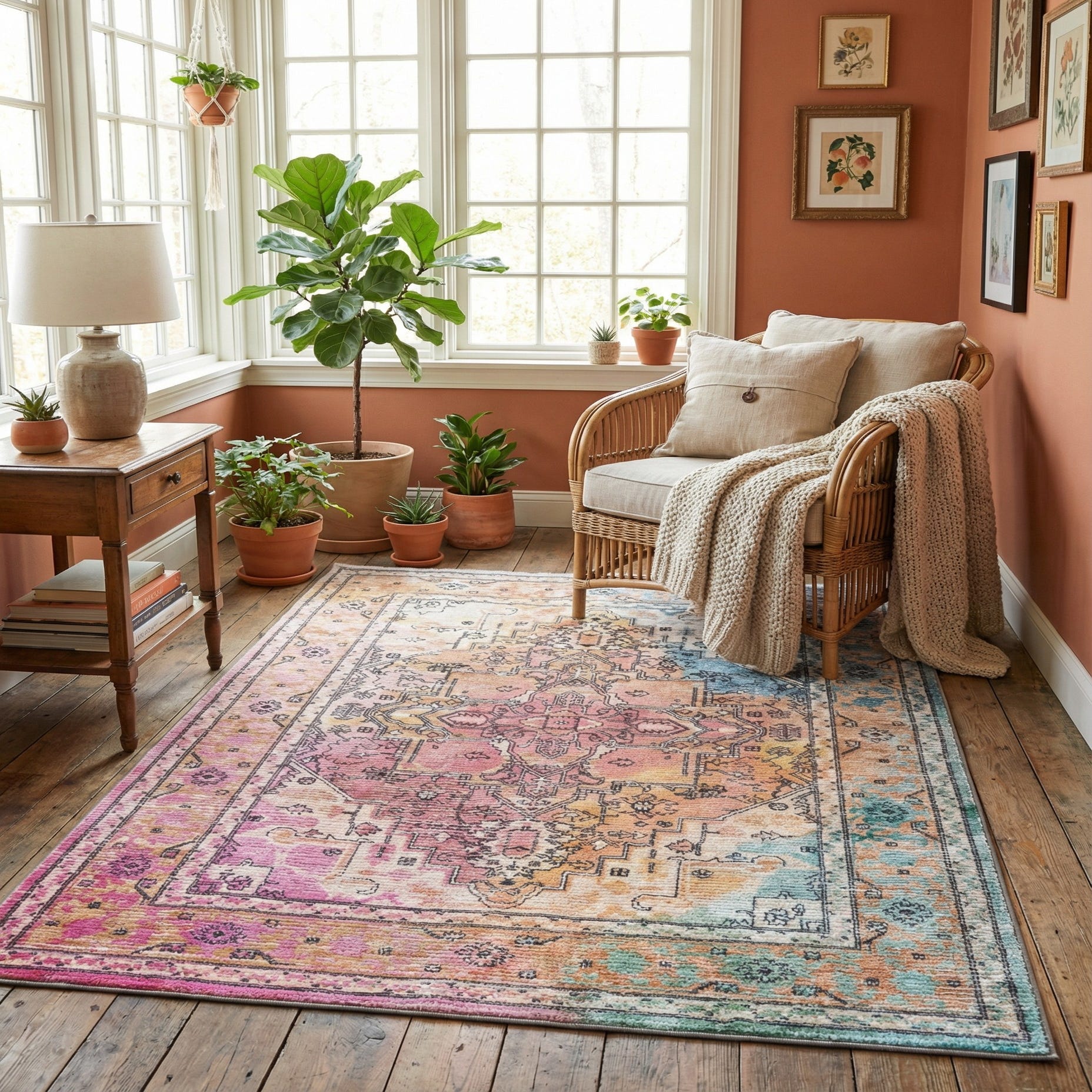 Primary color is Multi. Colors in this rug include: Multi, Beige, Black, Blue, Brown, Ivory, Green, Pink.