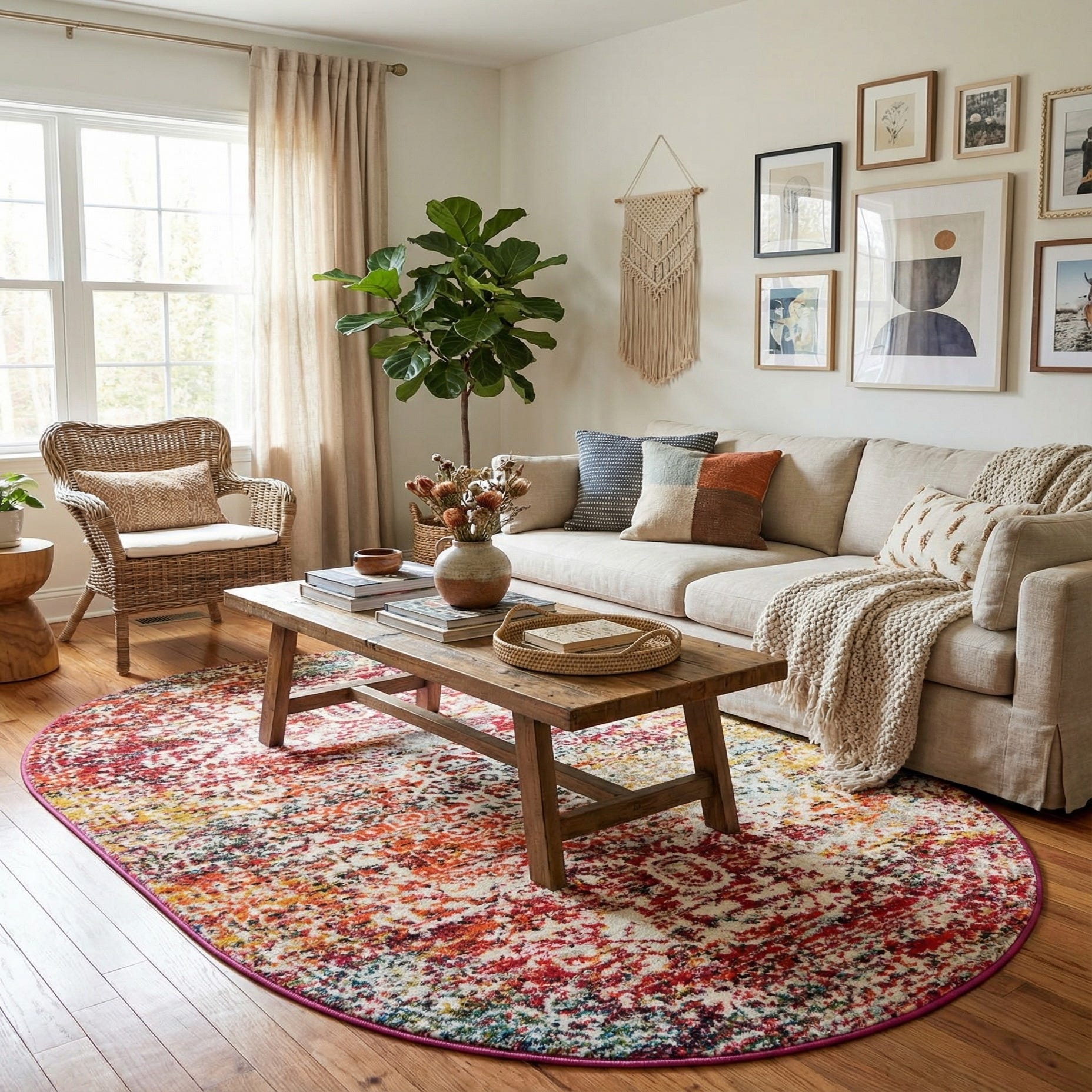 Primary color is Multi. Colors in this rug include: Multi, Black, Gray, Ivory, Orange, Red, Yellow.