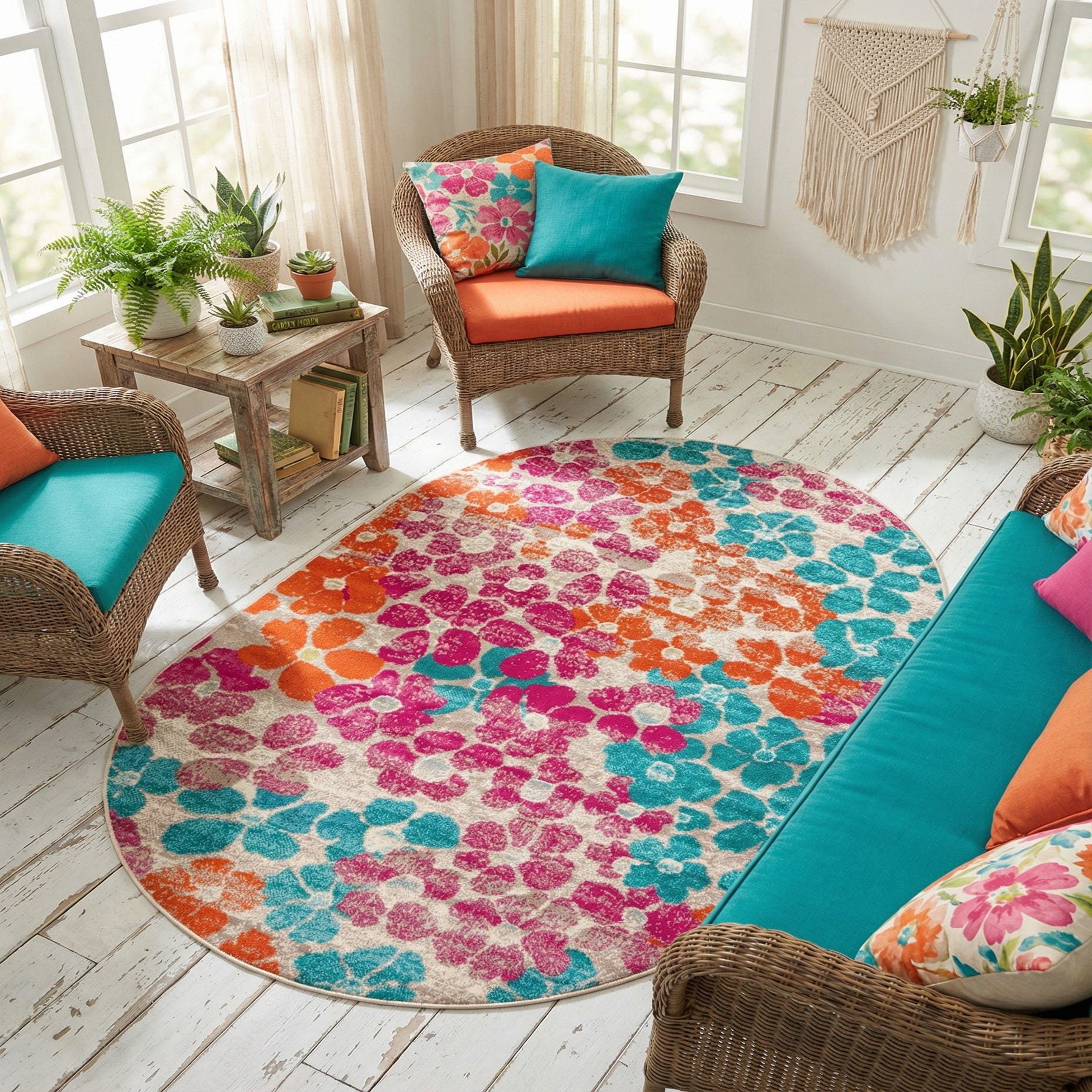 Primary color is Multi. Colors in this rug include: Multi, Gray, Ivory, Orange, Turquoise, Pink.