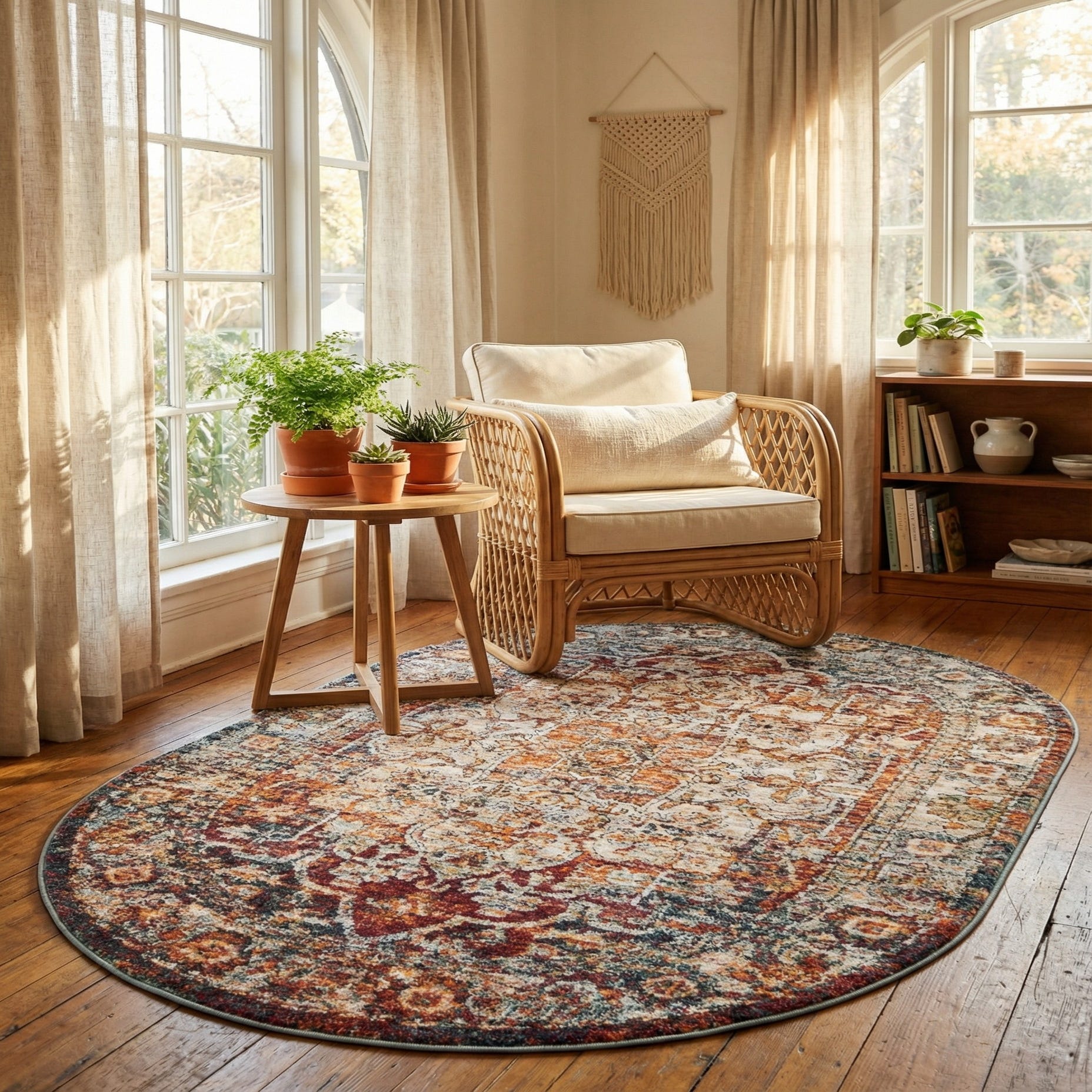 Primary color is Multi. Colors in this rug include: Multi, Beige, Black, Blue, Gray, Green, Orange, Red, Ivory.