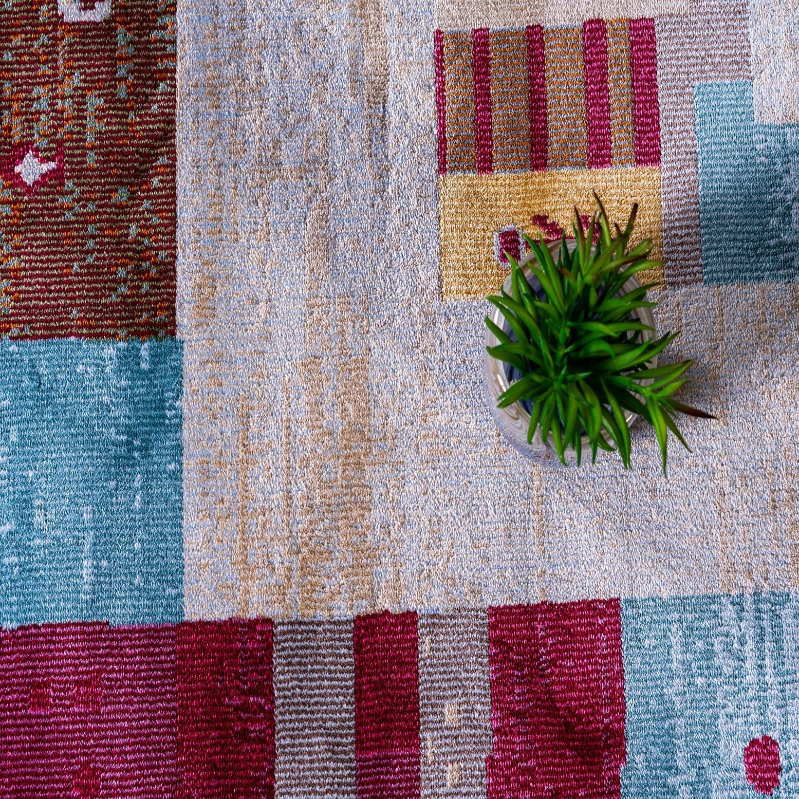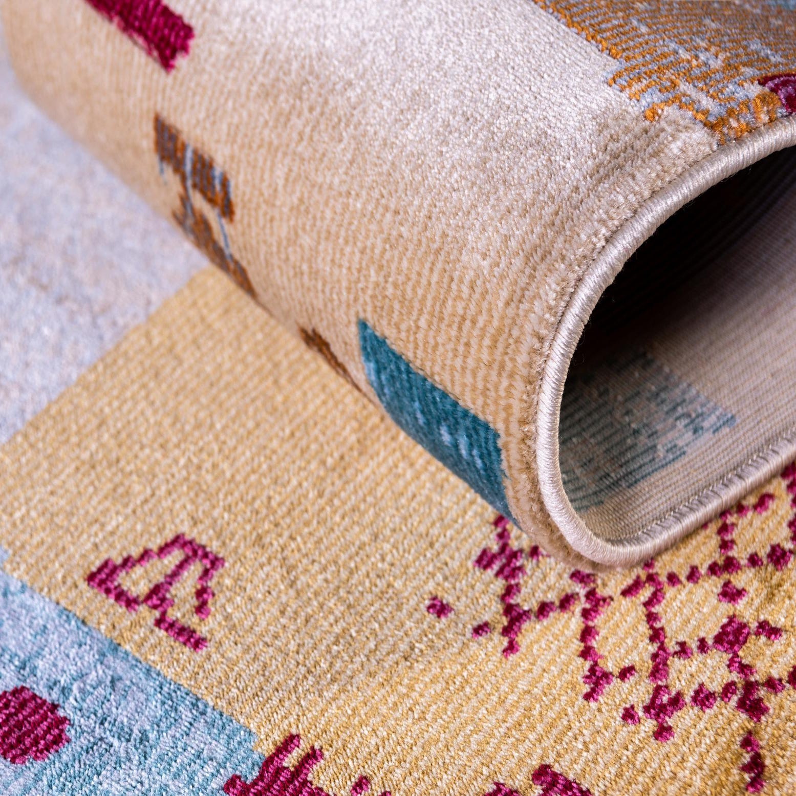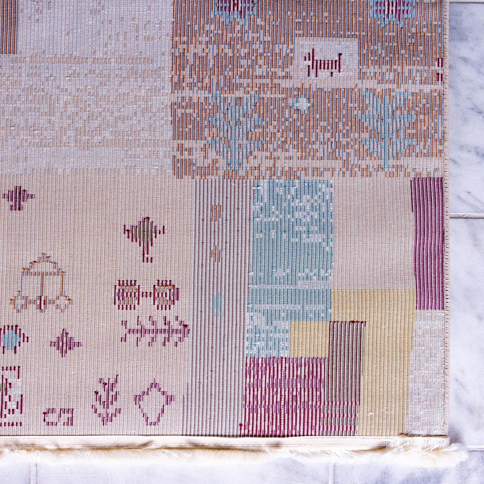 Primary color is Multi. Colors in this rug include: Multi, Blue, Brown, Gold, Ivory, Light Green, Tan, Pink.