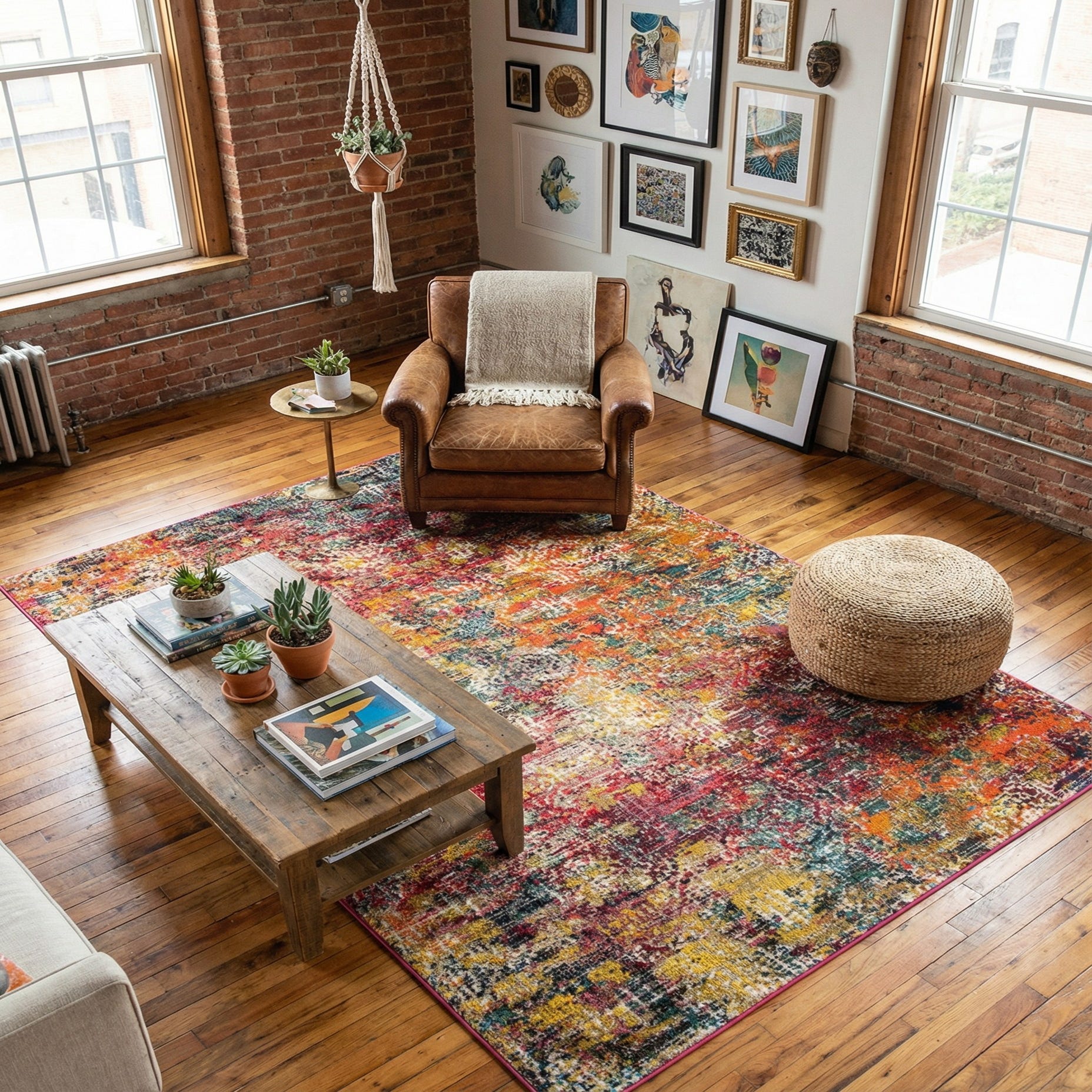 Primary color is Multi. Colors in this rug include: Multi, Ivory, Green, Light Blue, Orange, Pink.