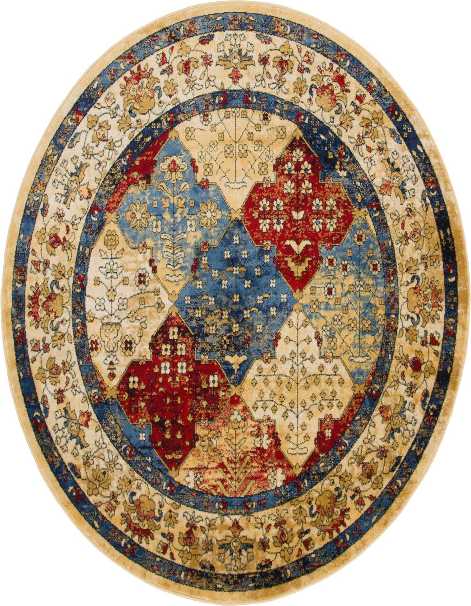 Primary color is Multi. Colors in this rug include: Multi, Beige, Black, Blue, Ivory, Red.