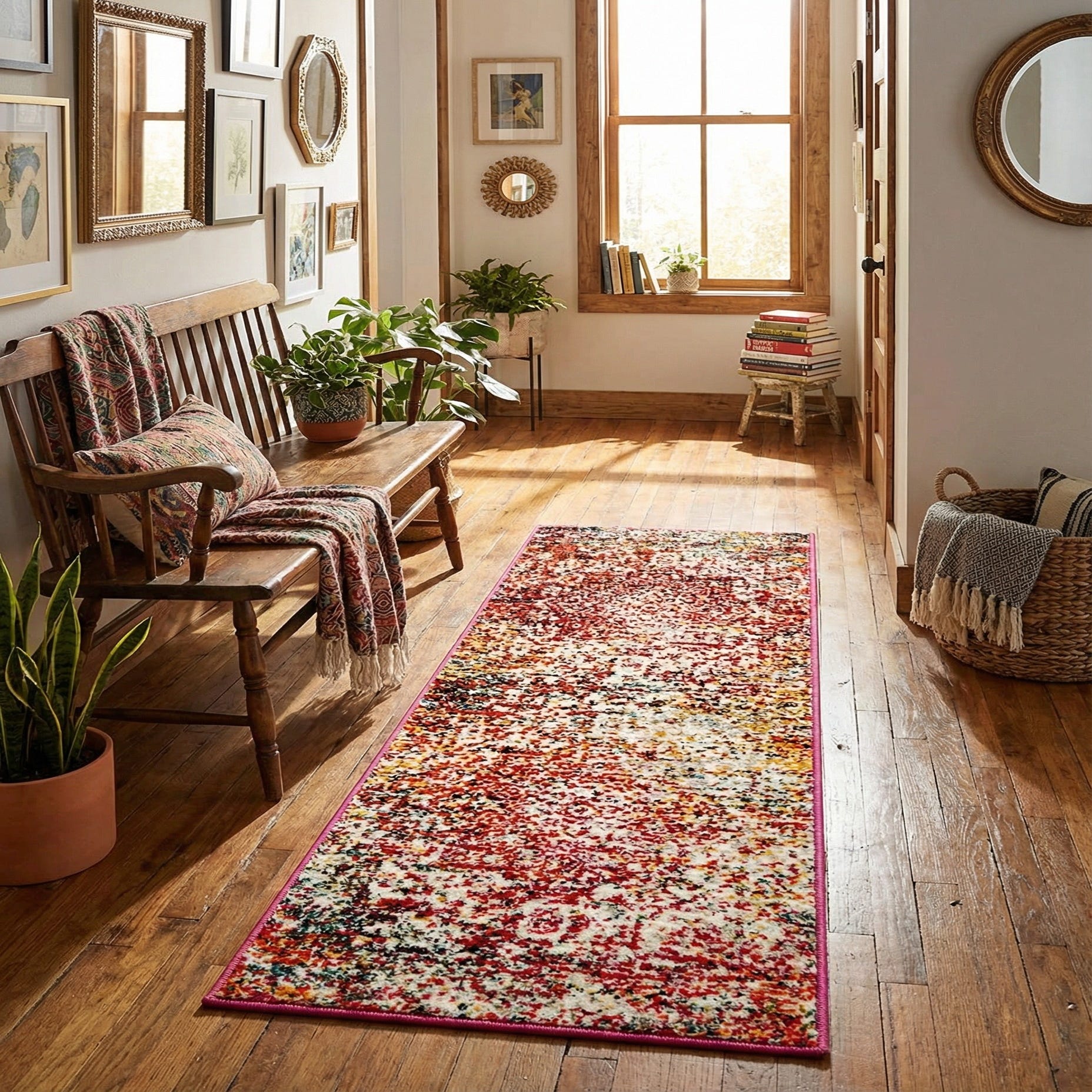 Primary color is Multi. Colors in this rug include: Multi, Black, Gray, Ivory, Orange, Red, Yellow.