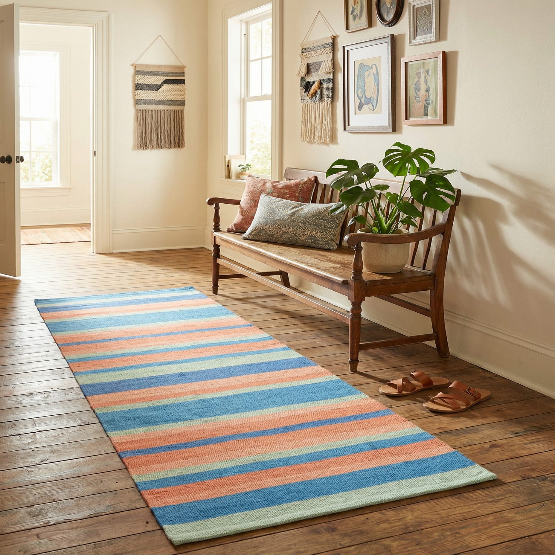 Primary color is Multi. Colors in this rug include: Multi, Light Blue, Light Green, Peach, Pink, Blue.