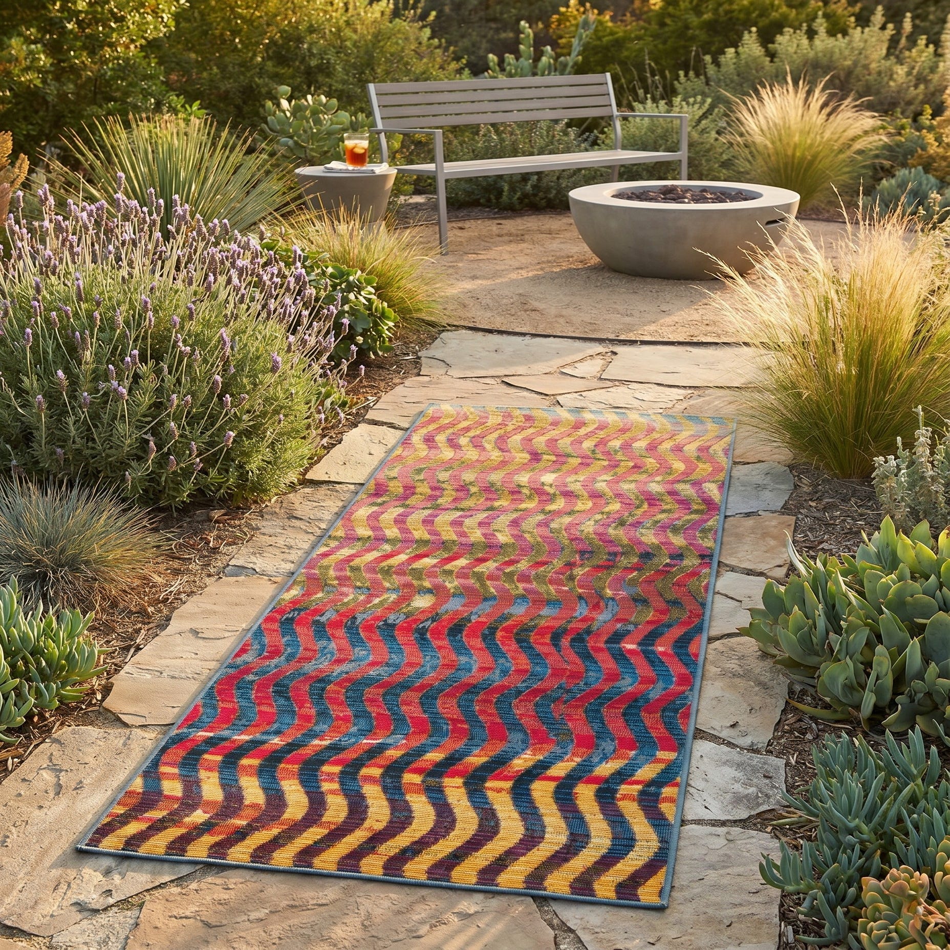 Fell in love with this rug when I saw it on-line for its delightful pattern and vivid colors. It arrived in two days from the day ordered about a week ago. We put it down on our renovated deck today...it is even more awesome than we thought it would be! The colors and pattern outset the colors of the deck perfectly.