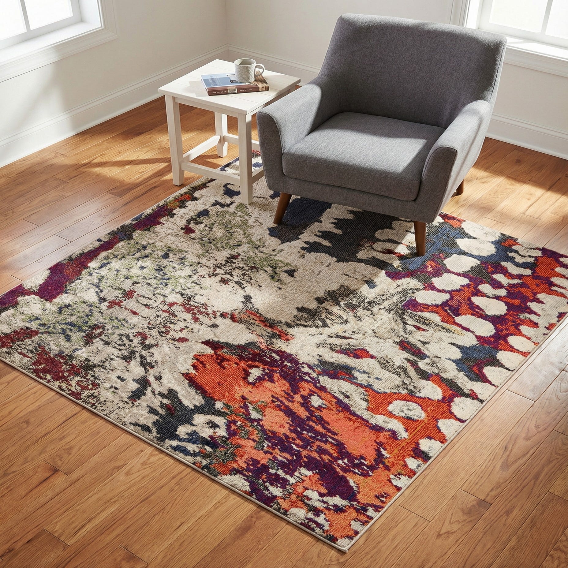 Primary color is Multi. Colors in this rug include: Multi, Black, Gray, Ivory, Navy Blue, Red, Purple.