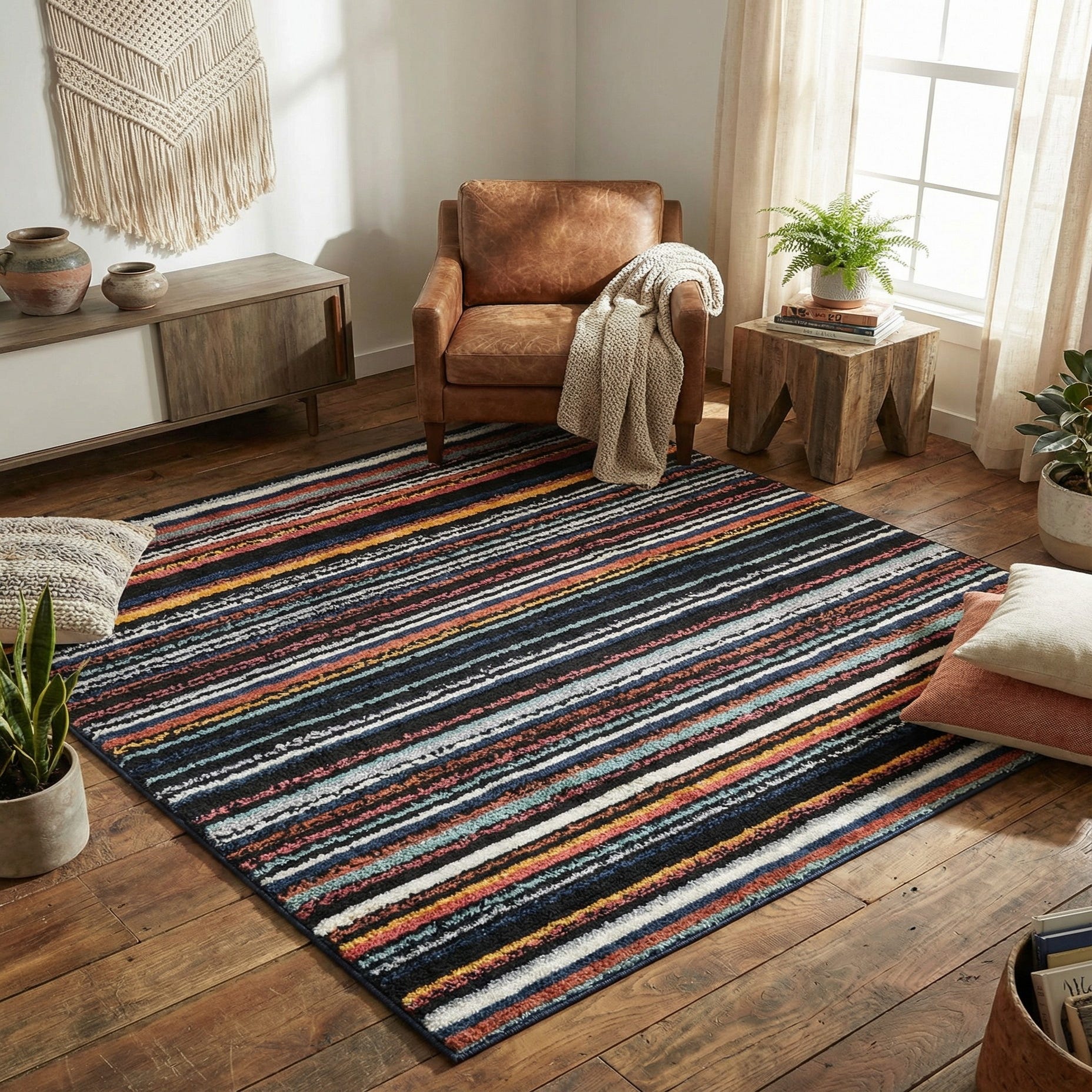 Primary color is Multi. Colors in this rug include: Multi, Black, Blue, Ivory, Gray, Light Blue, Peach, Yellow, Pink, Navy Blue.