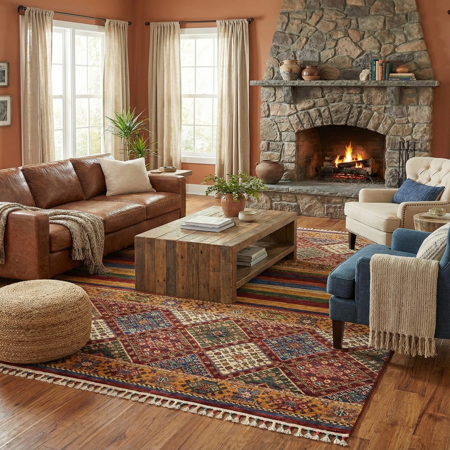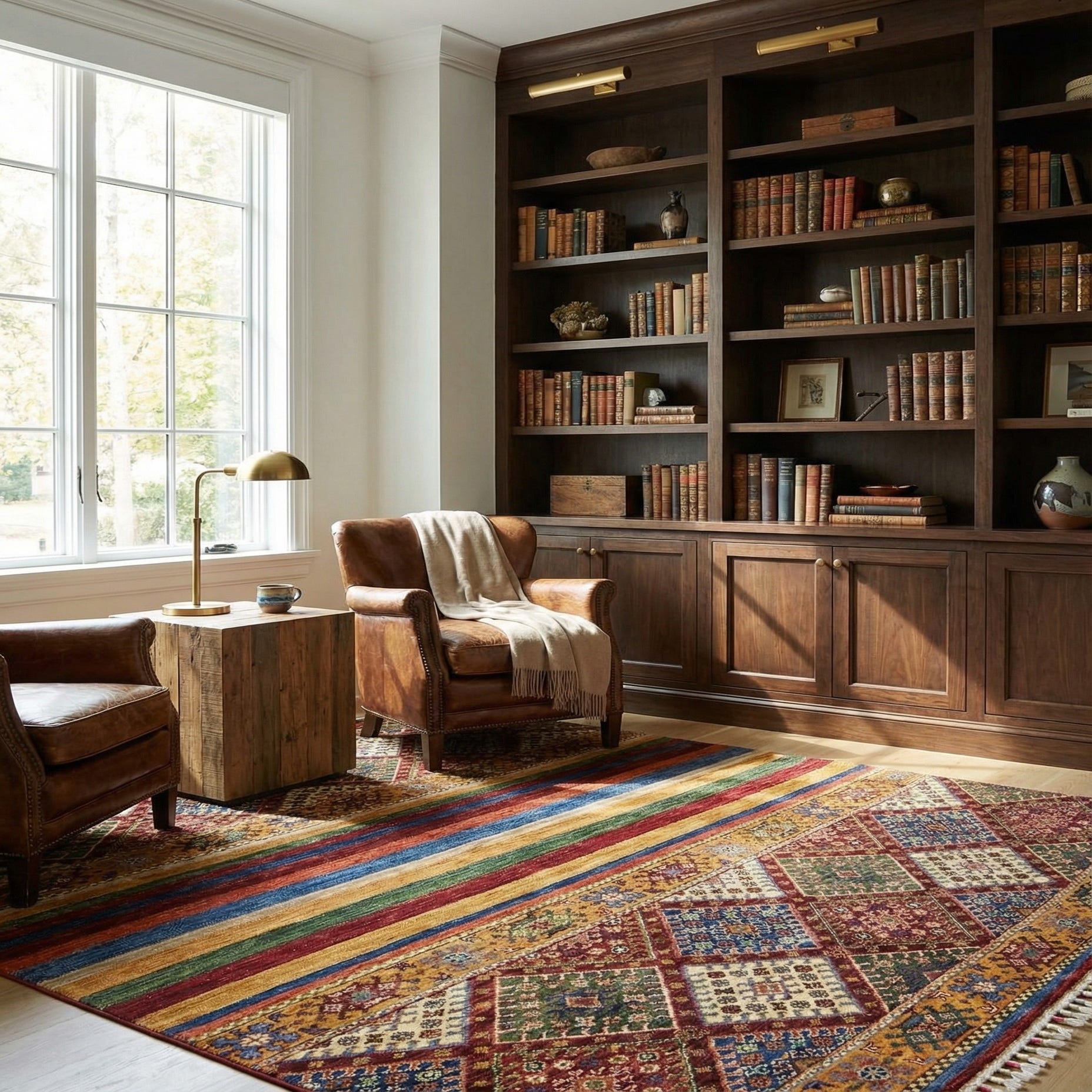 Primary color is Multi. Colors in this rug include: Multi, Blue, Cream, Gold, Green, Orange, Navy Blue, Beige, Red.