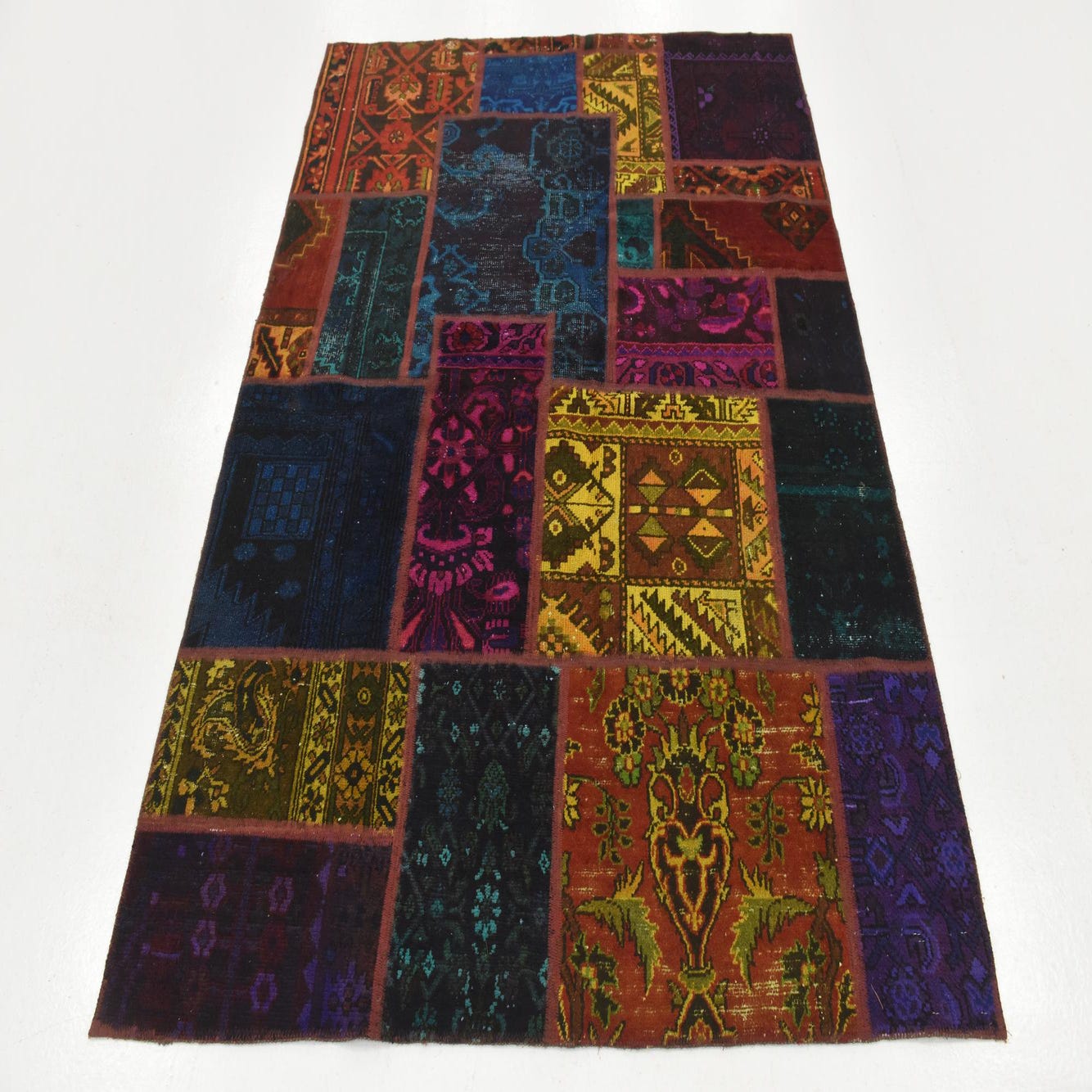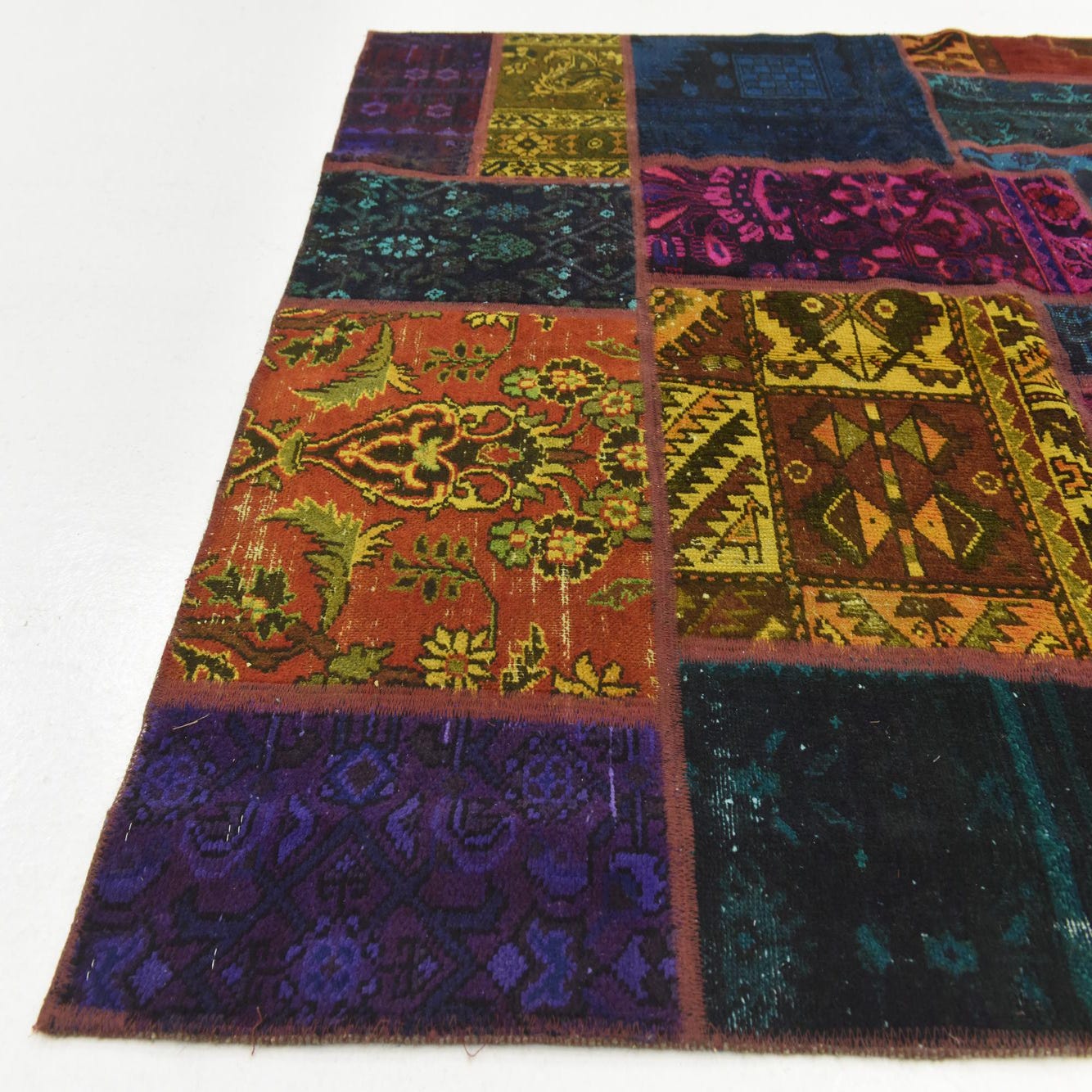 Primary color is Multi. Colors in this rug include: Multi, Black, Green, Hunter Green, Teal, Yellow, Violet, Pink.