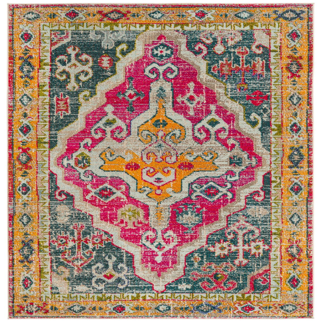 Primary color is Multi. Colors in this rug include: Multi, Gray, Green, Light Blue, Light Brown, Navy Blue, Orange.