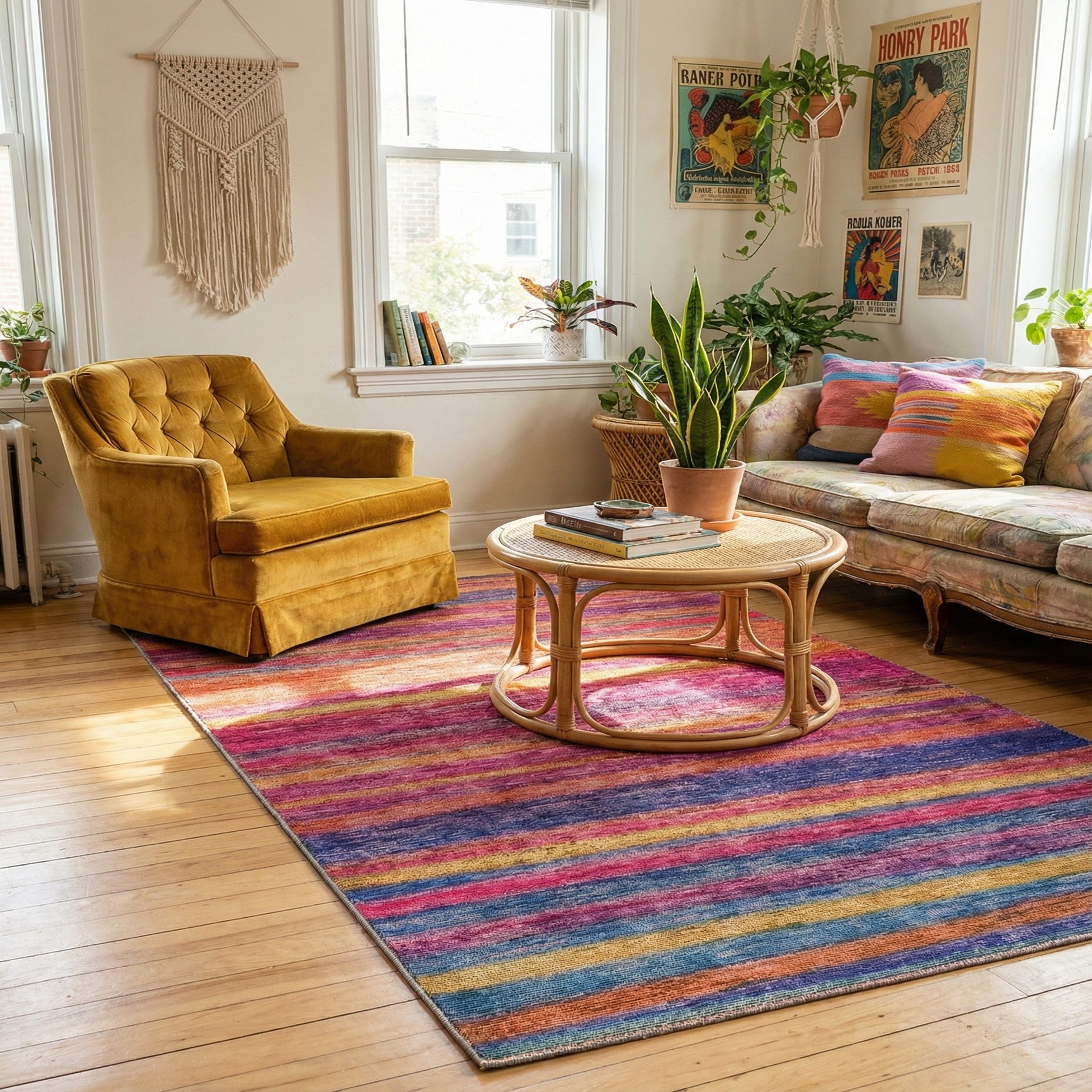 Primary color is Multi. Colors in this rug include: Multi, Blue, Brown, Ivory, Navy Blue, Orange, Yellow, Pink, Terracotta, Purple.