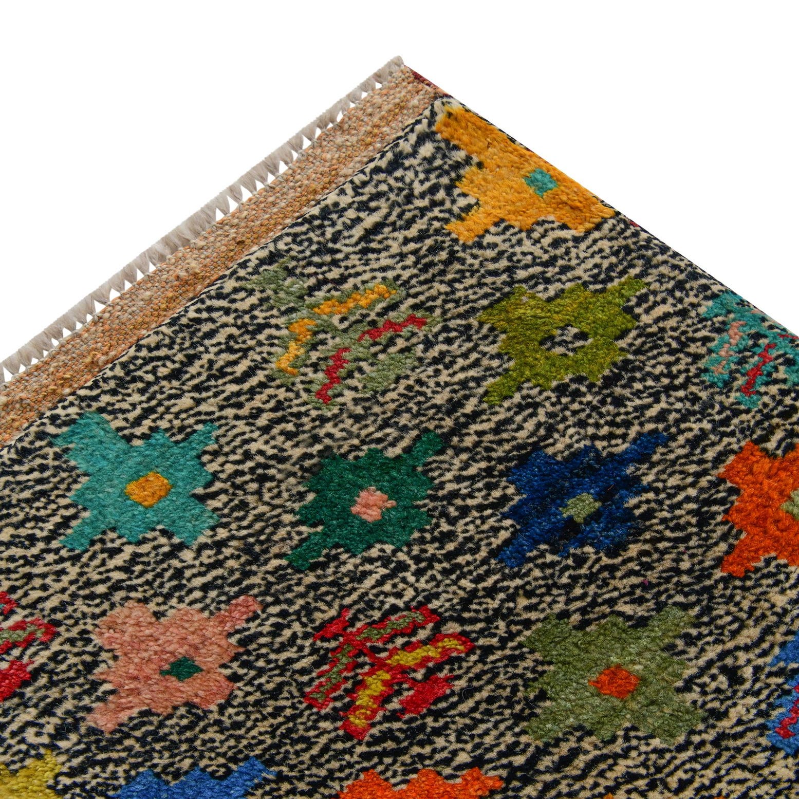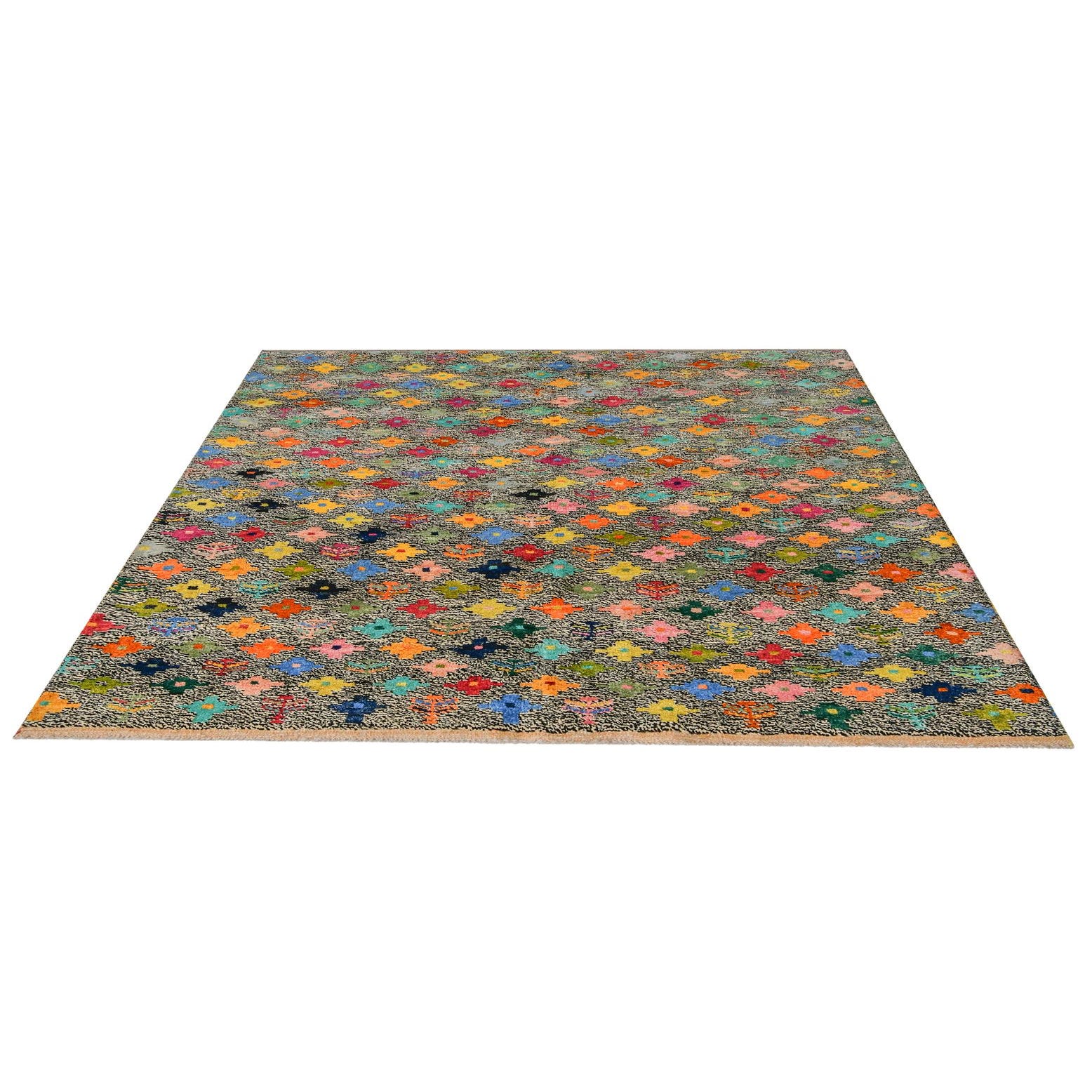 Primary color is Multi. Colors in this rug include: Multi, Beige, Black, Blue, Brown, Green, Ivory, Orange, Yellow, Pink, Navy Blue.