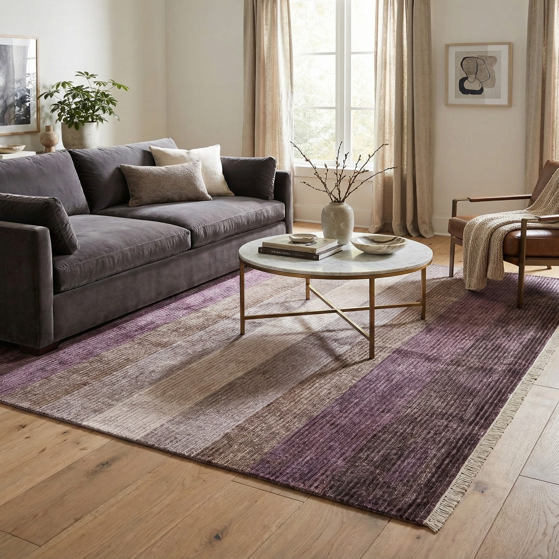 Primary color is Multi. Colors in this rug include: Multi, Gray, Light Brown, Peach, Puce, Tan, Purple.