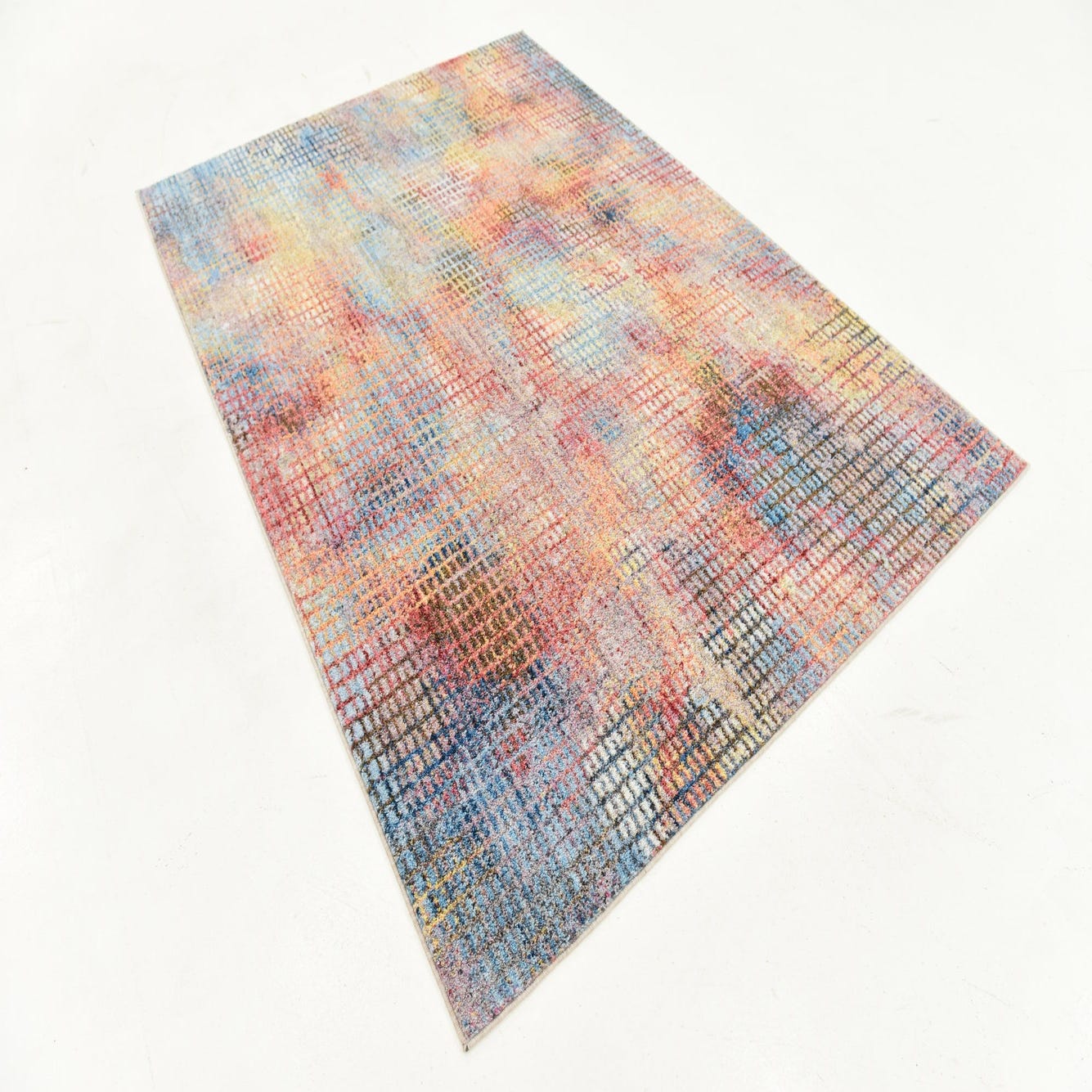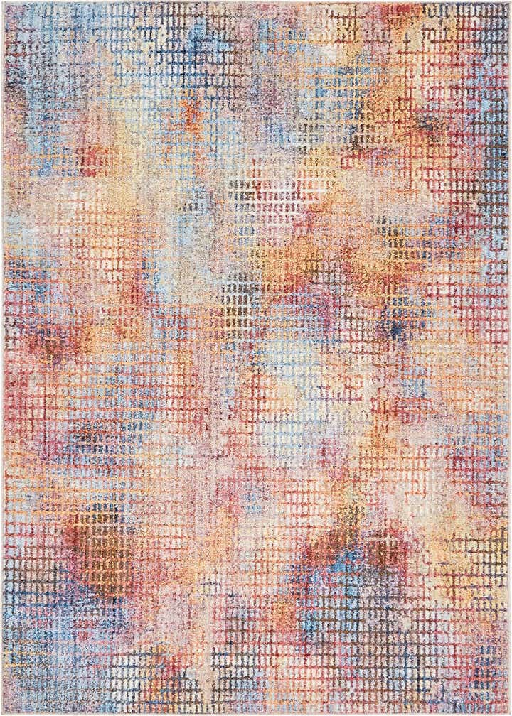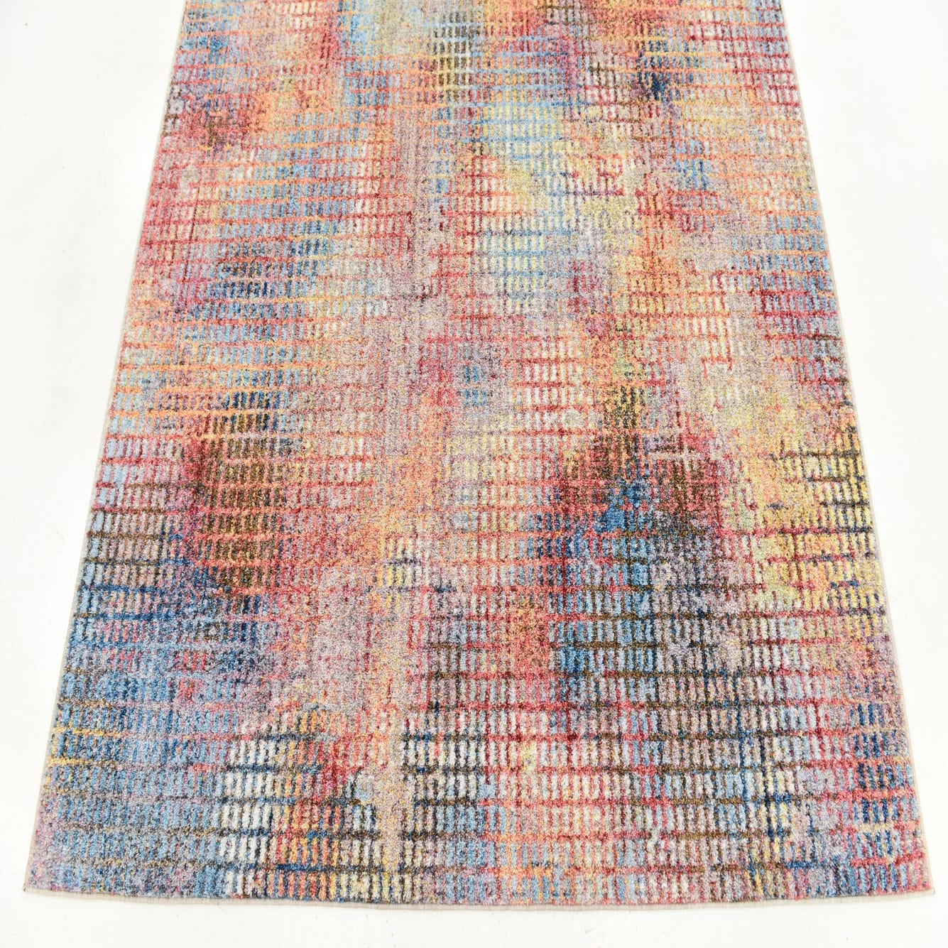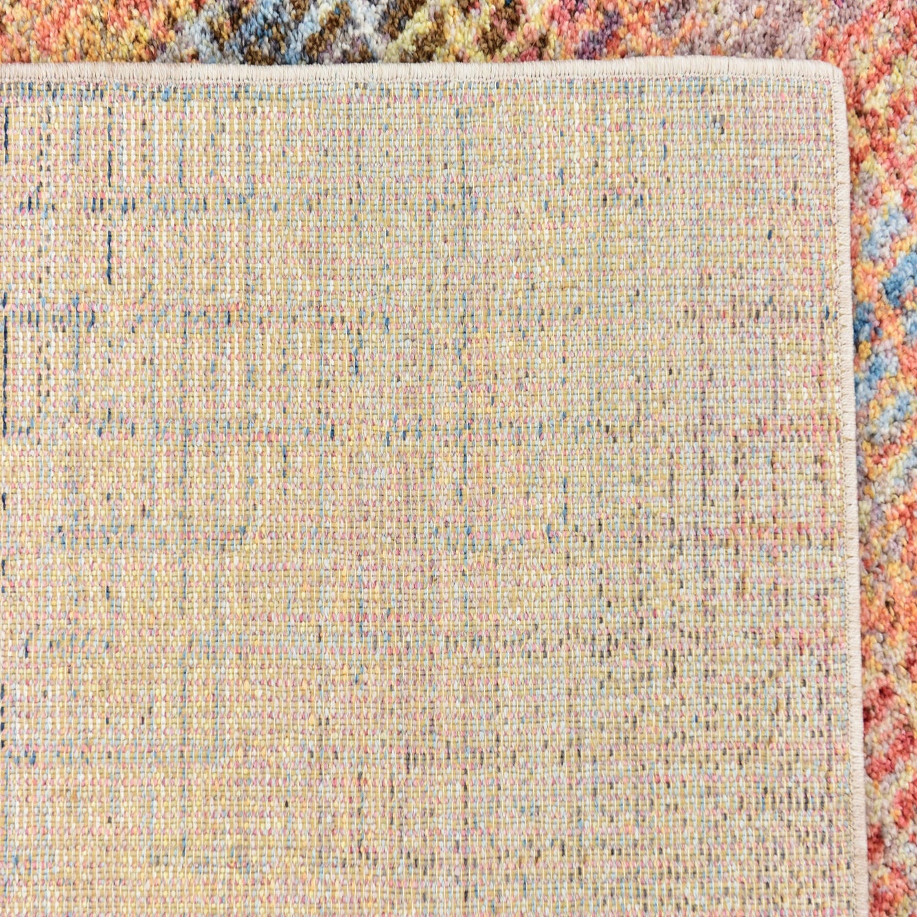 Primary color is Multi. Colors in this rug include: Multi, Blue, Cream, Orange, Red, Yellow, Purple, Beige, Brown.