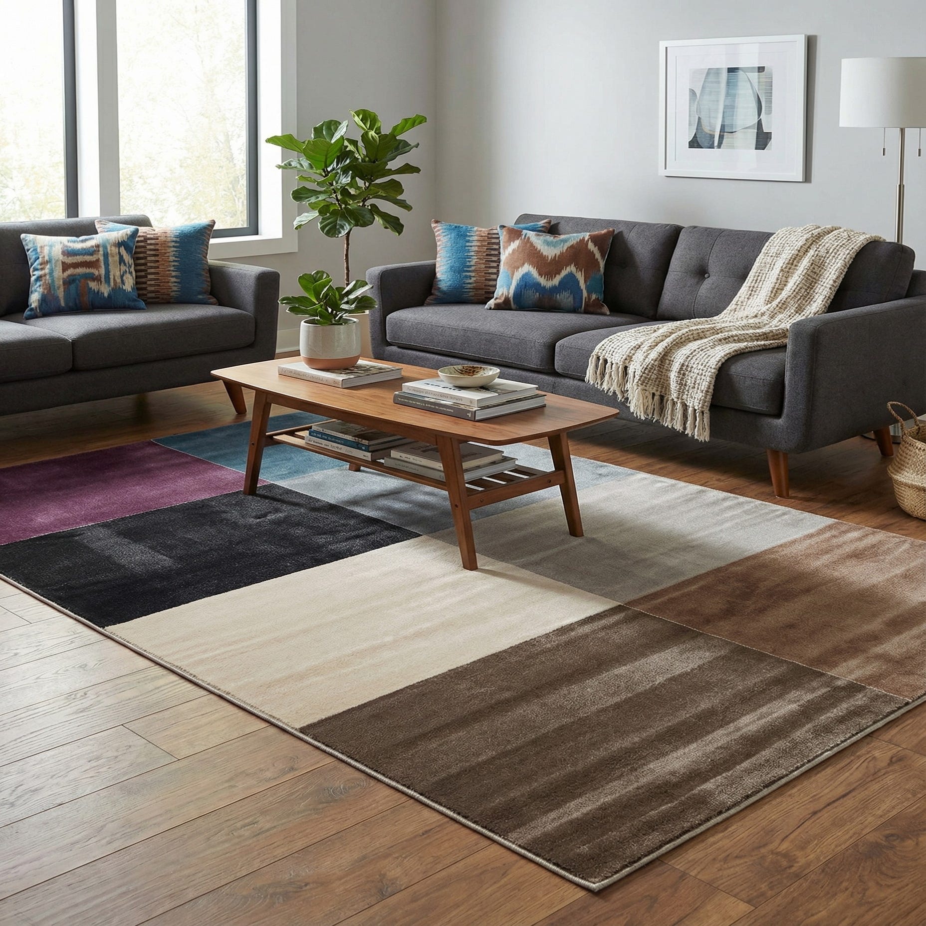 Primary color is Multi. Colors in this rug include: Multi, Black, Brown, Gray, Light Blue, Light Brown, Violet, Ivory, Cream.