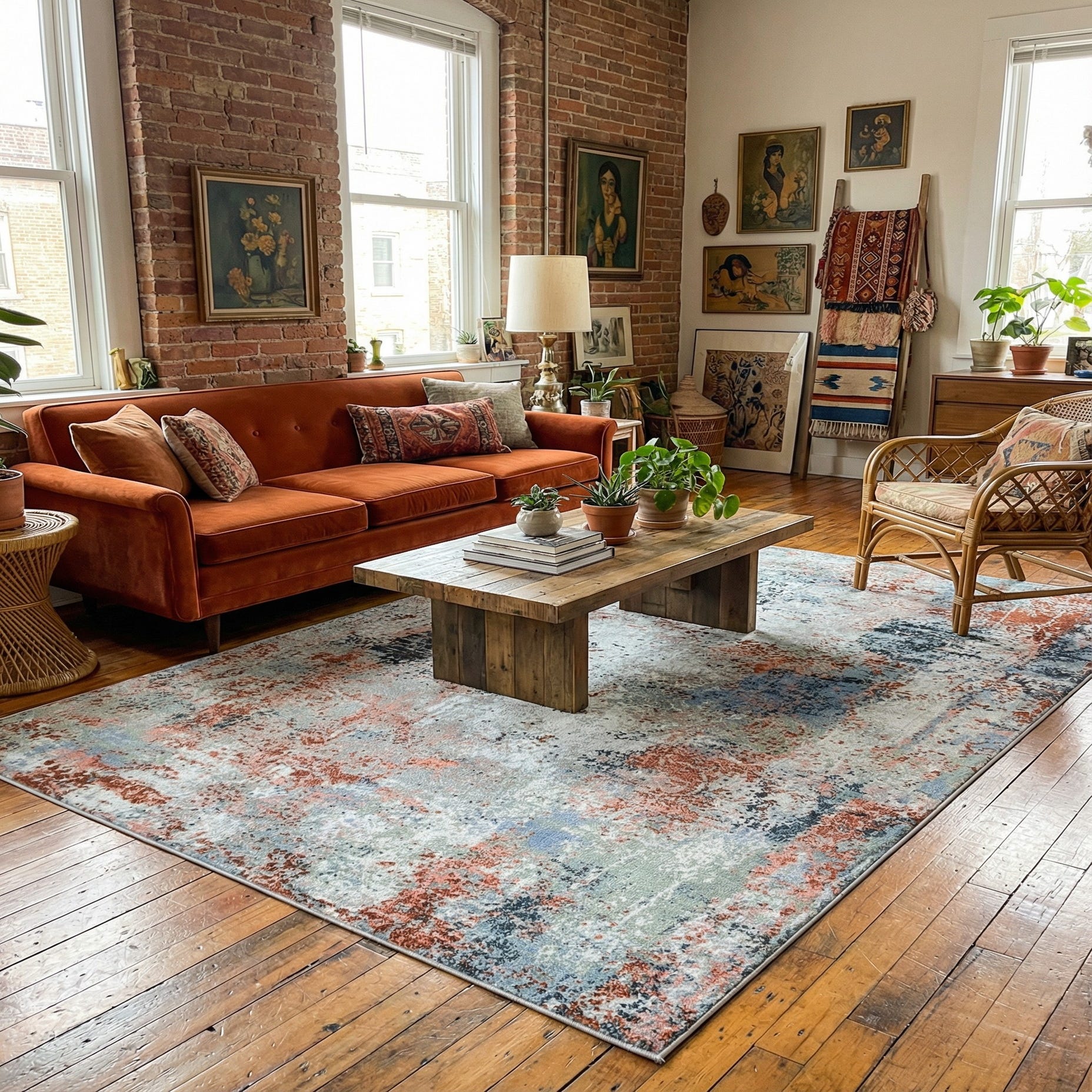 Primary color is Multi. Colors in this rug include: Multi, Blue, Gray, Light Blue, Navy Blue, Rust Red, Pink.