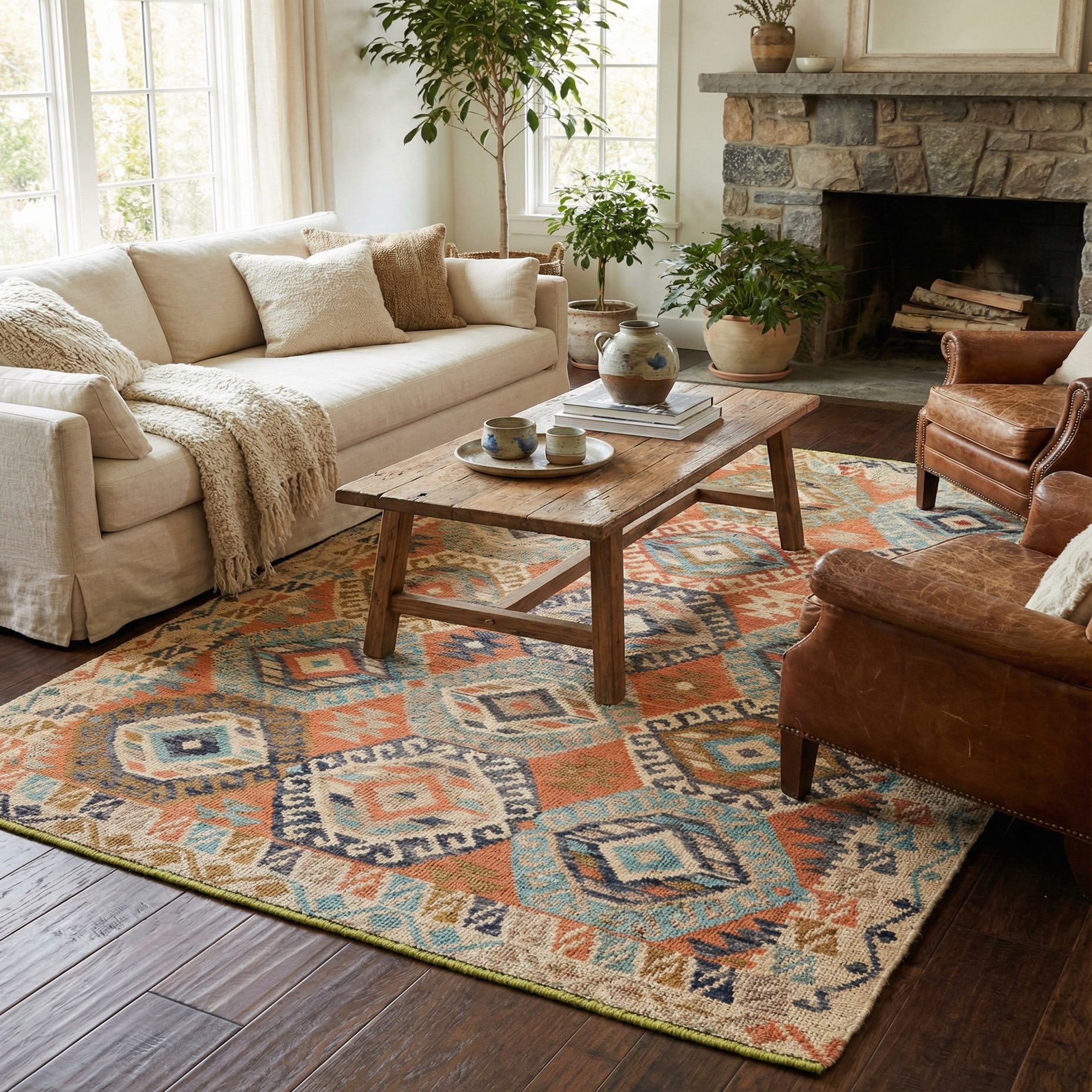 Primary color is Multi. Colors in this rug include: Multi, Beige, Black, Blue, Brown, Gray, Ivory, Light Brown, Light Green, Light Salmon, Rust Red, Tan, Teal, Terracotta, Light Blue.