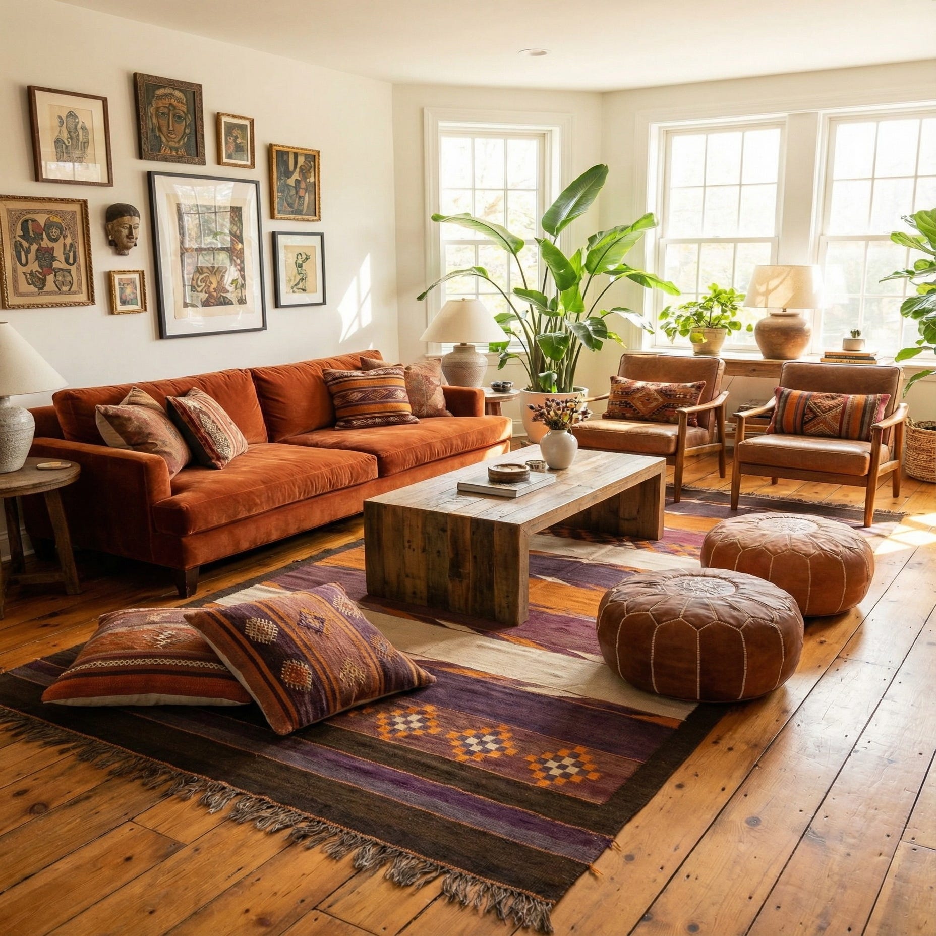 Primary color is Multi. Colors in this rug include: Multi, Brown, Orange, Purple, Ivory.