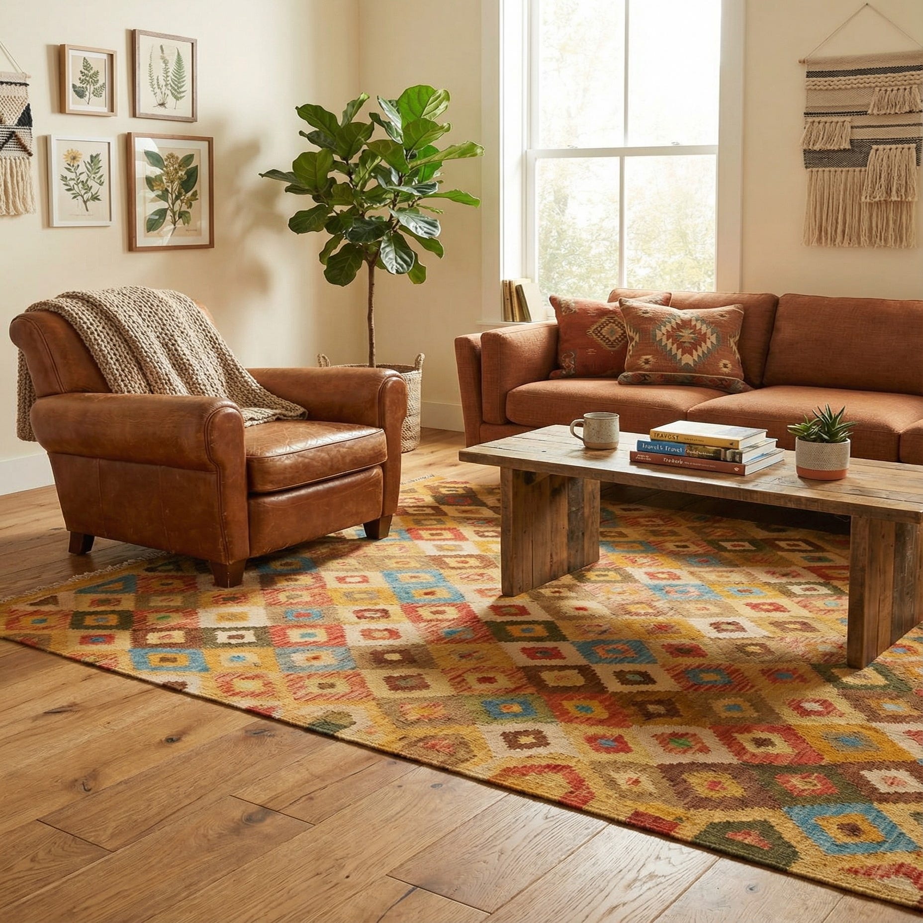 Primary color is Multi. Colors in this rug include: Multi, Beige, Blue, Brown, Gold, Olive, Red.