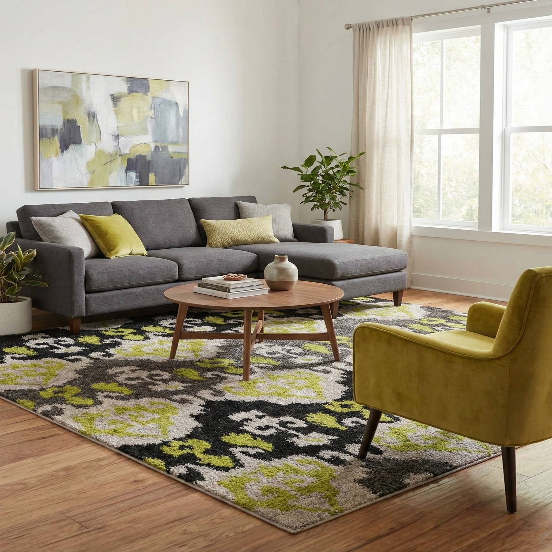 Primary color is Multi. Colors in this rug include: Multi, Black, Gray, Green, Ivory.
