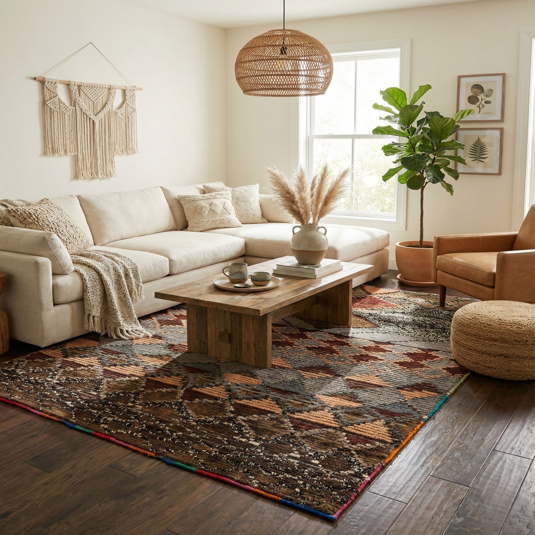 Primary color is Multi. Colors in this rug include: Multi, Beige, Black, Blue, Brown, Light Brown, Gray.