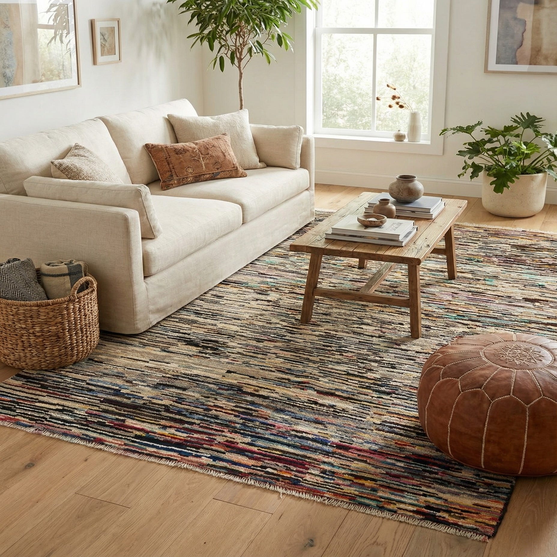 Primary color is Multi. Colors in this rug include: Multi, Beige, Black, Blue, Brown, Ivory, Light Blue, Red, Pink.