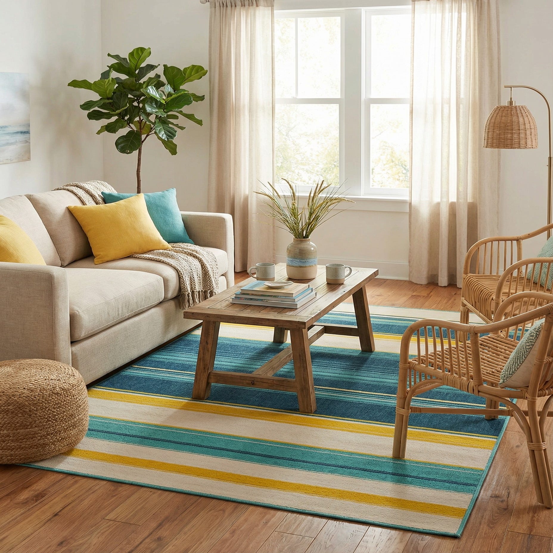 Primary color is Multi. Colors in this rug include: Multi, Ivory, Navy Blue, Yellow, Teal.