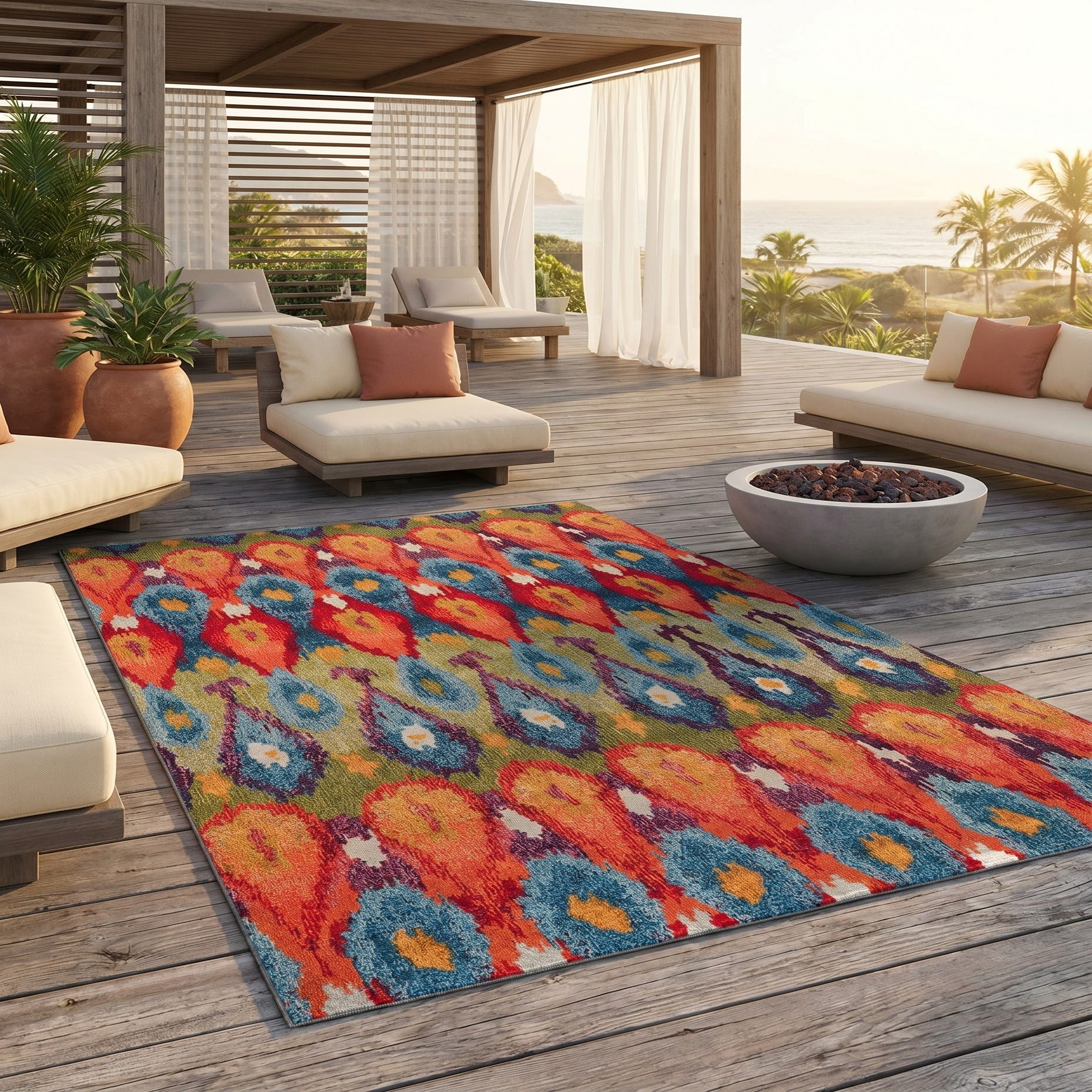 Fell in love with this rug when I saw it on-line for its delightful pattern and vivid colors. It arrived in two days from the day ordered about a week ago. We put it down on our renovated deck today...it is even more awesome than we thought it would be! The colors and pattern outset the colors of the deck perfectly.