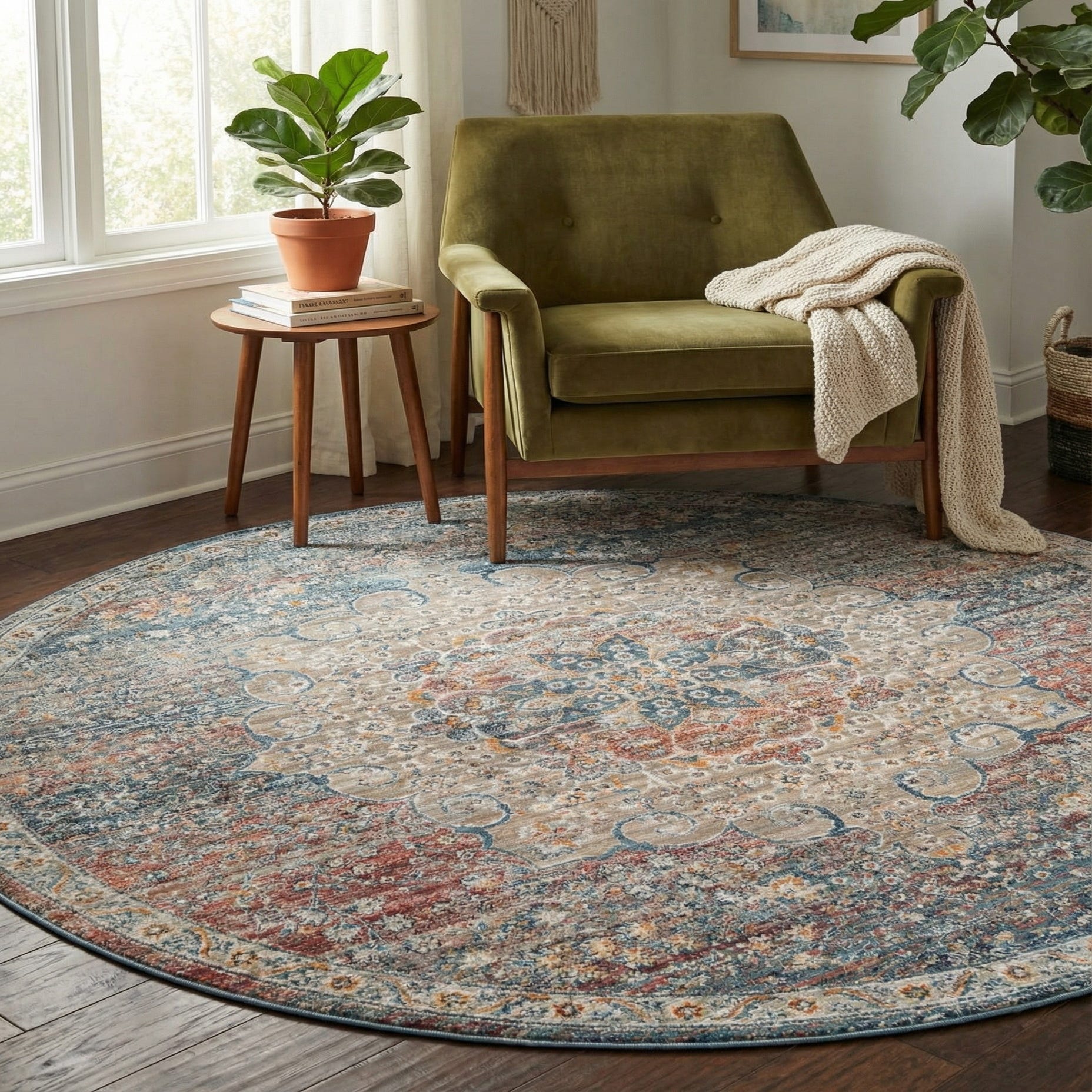 Primary color is Multi. Colors in this rug include: Multi, Blue, Gray, Ivory, Light Blue, Light Brown, Rust Red, Terracotta.