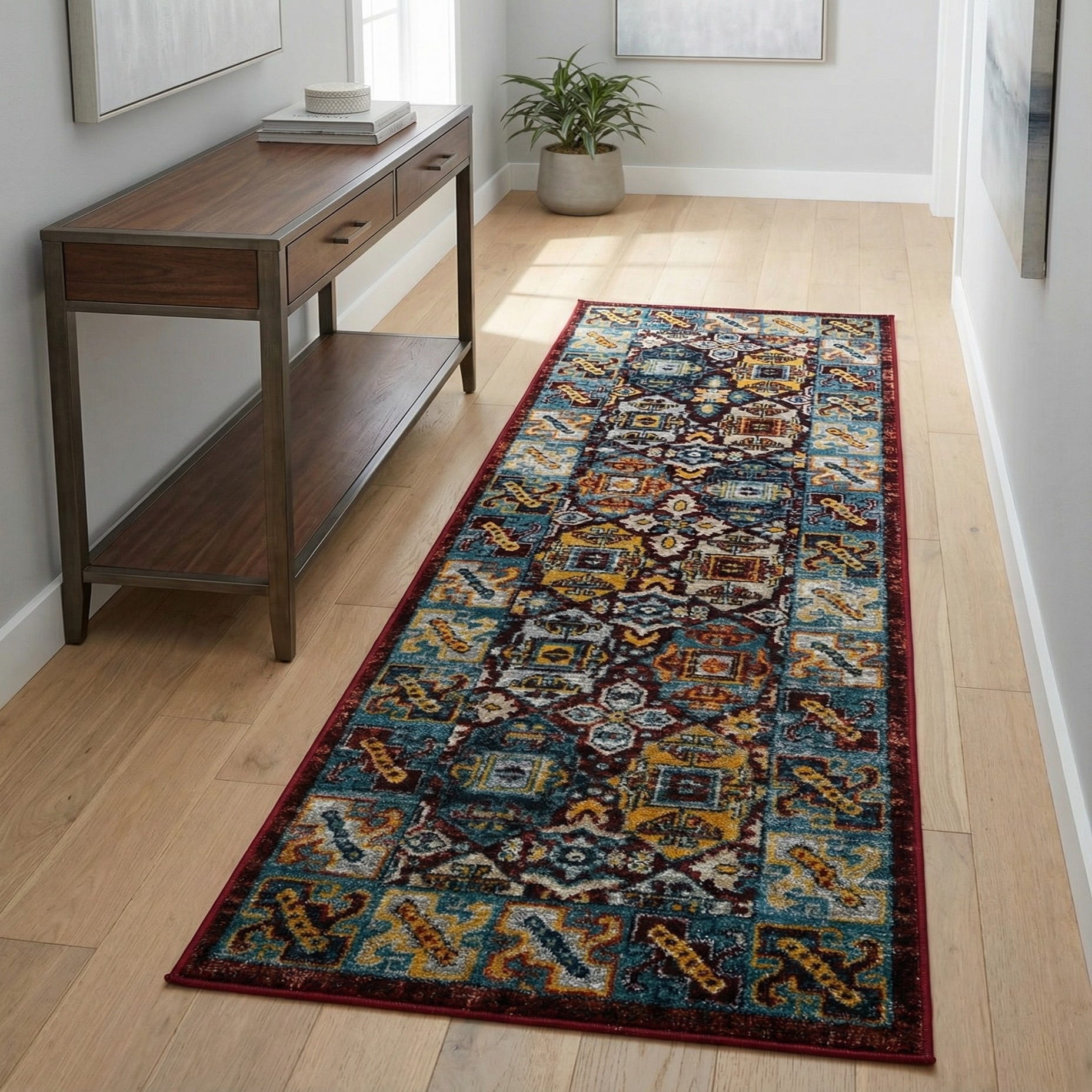 Primary color is Multi. Colors in this rug include: Multi, Black, Blue, Gray, Ivory, Red, Yellow, Beige.