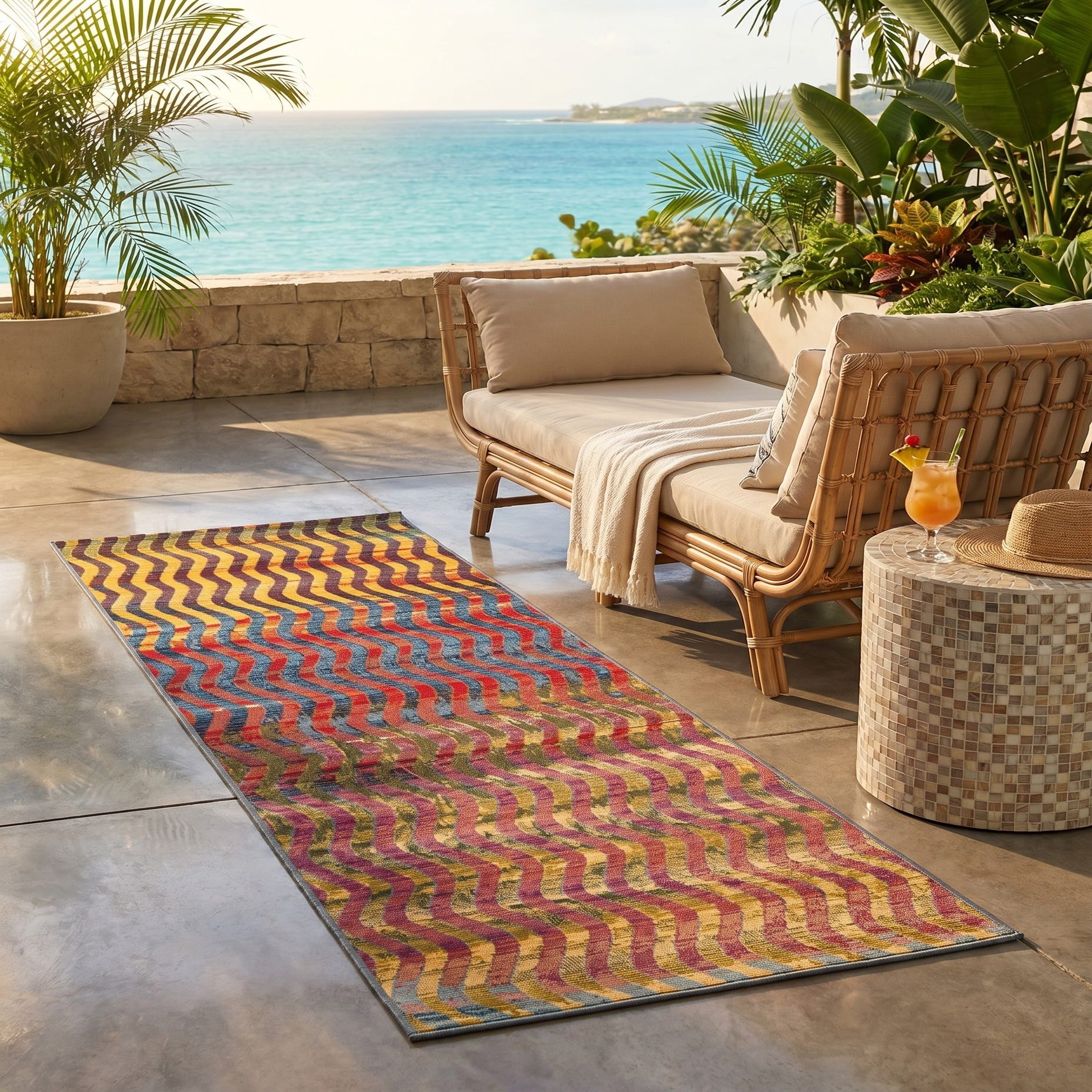 Fell in love with this rug when I saw it on-line for its delightful pattern and vivid colors. It arrived in two days from the day ordered about a week ago. We put it down on our renovated deck today...it is even more awesome than we thought it would be! The colors and pattern outset the colors of the deck perfectly.