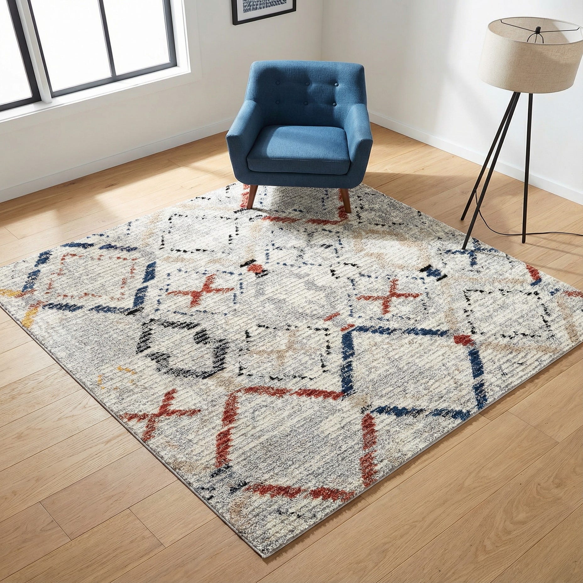 Primary color is Multi. Colors in this rug include: Multi, Beige, Black, Ivory, Navy Blue, Rust Red, Gray.