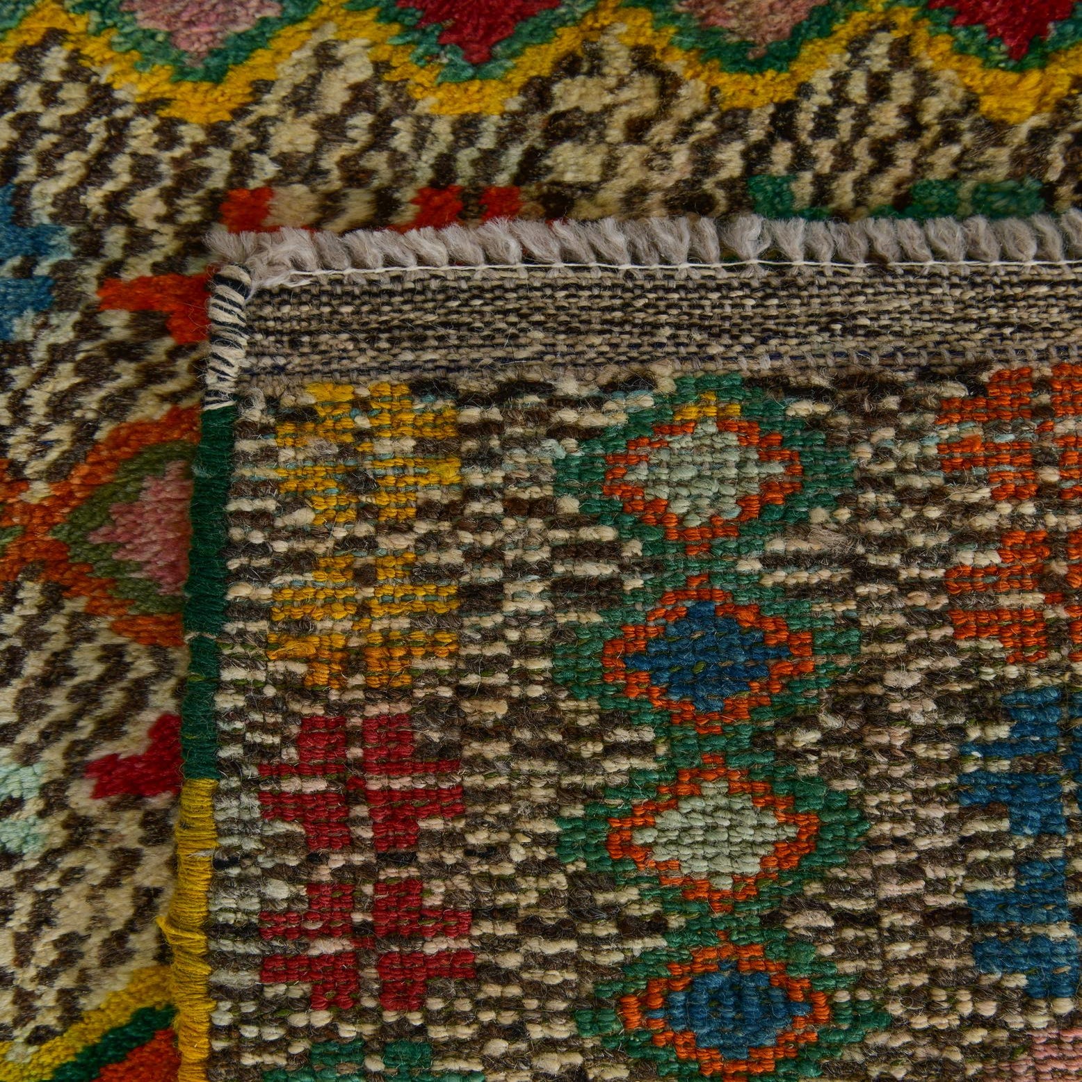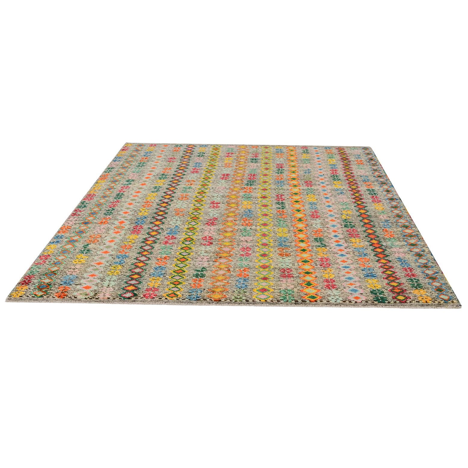 Primary color is Multi. Colors in this rug include: Multi, Beige, Black, Blue, Brown, Gray, Green, Olive, Orange, Red, Yellow, Pink.