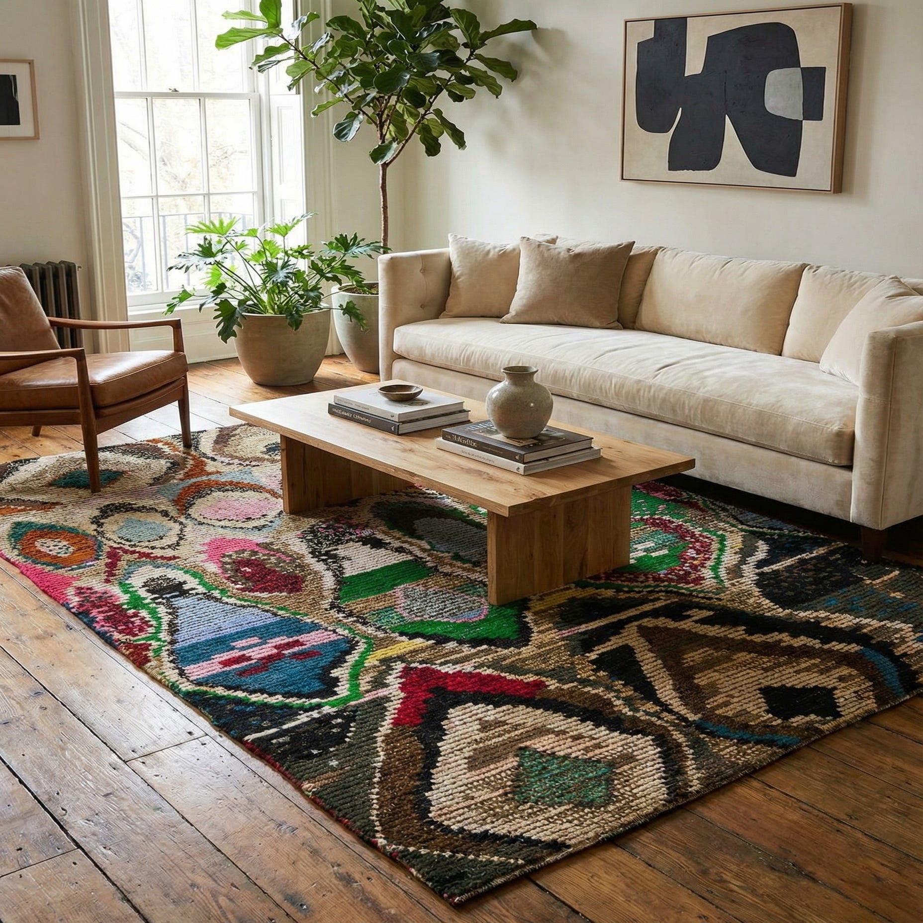 Primary color is Multi. Colors in this rug include: Multi, Beige, Black, Blue, Brown, Green, Light Blue, Pink, Yellow, Red.